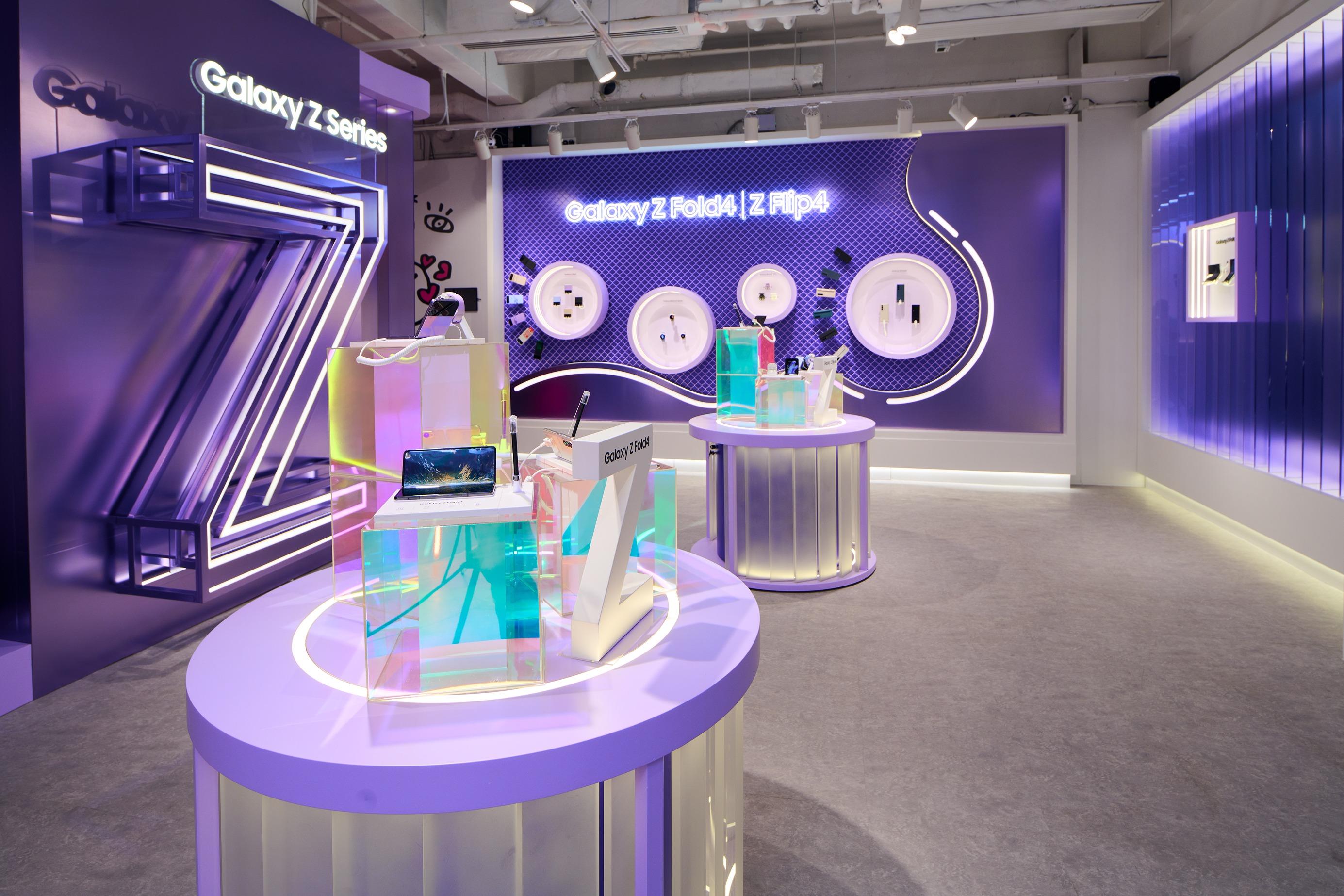有別於傳統展示櫃位,期間限定店劃分成多個時尚空間,讓用家體驗Flex模式拍攝。限定店以Bora紫作主調,外型恰似一座歐式建築,穿過以立體玻璃折射紫色彩光、科技感極強的入口後,所有顧客都可於入口免費租借Galaxy Z Fold4或Z Flip4 打卡,無條件率先試玩多項功能。