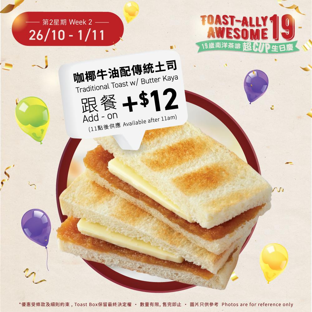 從10月26日至11月1日,顧客在11點後購買餐點,只需額外加$12跟餐即可享用咖椰牛油傳統土司。
