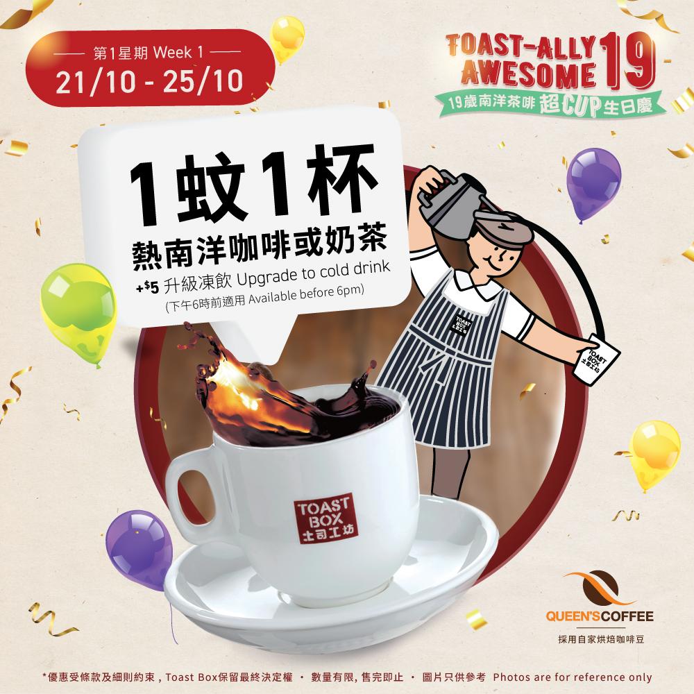 Toast Box踏入19週年,推出多個優惠,與市民齊齊慶祝生日!包括有$1歎南洋咖啡或奶茶、完成任務有機會贏取$1000現金券等。