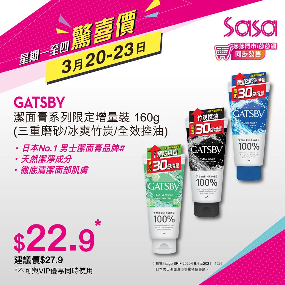 莎莎今期驚喜價有GRACE ONE抗氧拉提/肌色修正精華 30ml $149/件、GATSBY潔面膏系列限定增量裝 $22.9/件、50惠男士育髮激活精華/黑髮激活精華$348/$373/件,助你保持完美面貌!
