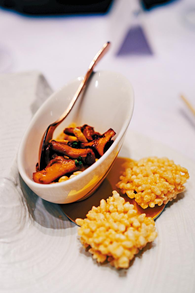 頭盤「野菌三弄」$388─以鹽燒松茸、頭抽香煎雞㙡菌及煙燻肉蛋香雞油菌,透過多樣烹調手法,誘出松茸的幽香、雞㙡菌的鮮甜,以及雞油菌的細膩杏香,令人驚豔。「菌湯六重奏」$328─巧妙融合松茸、羊肚菌與黑虎掌,採用凍湯啫喱及溫熱燉湯兩種形式呈現,展現松茸的秀雅、羊肚菌的醇厚及黑虎掌的甘甜。凍湯啫喱的創意令人耳目一新,濃縮菌香於一口之間,齒頰留香。主菜「雞油菌香煎馬友」$208─以雞油菌腰果醬搭配鹽水醃製後香煎及炙烤的馬友,外皮香脆,魚肉軟嫩,與醬汁融合成絕妙滋味。另一道「雲來碧玉」$428─主角為釀入鮮黃耳的鮑魚,旁邊配以焗過的老人頭夾著雲南諾鄧火腿,加上松茸濃雞湯與乳扇,層次豐富芳香四溢,口感油潤而不膩。「美味牛肝菌冬坡玉」 $148─這道菜以冬瓜為主要食材,內部釀入炒香的牛肝菌,搭配濃郁的牛肝菌醬汁,讓人一口接一口,彷彿品嘗肉類料理般的滿足感。甜點「牛肝菌紫薯脆奶」及「南棗黑杞子珍珠玉露」$148─以菇菌作結,甜而不膩的完美句點。
