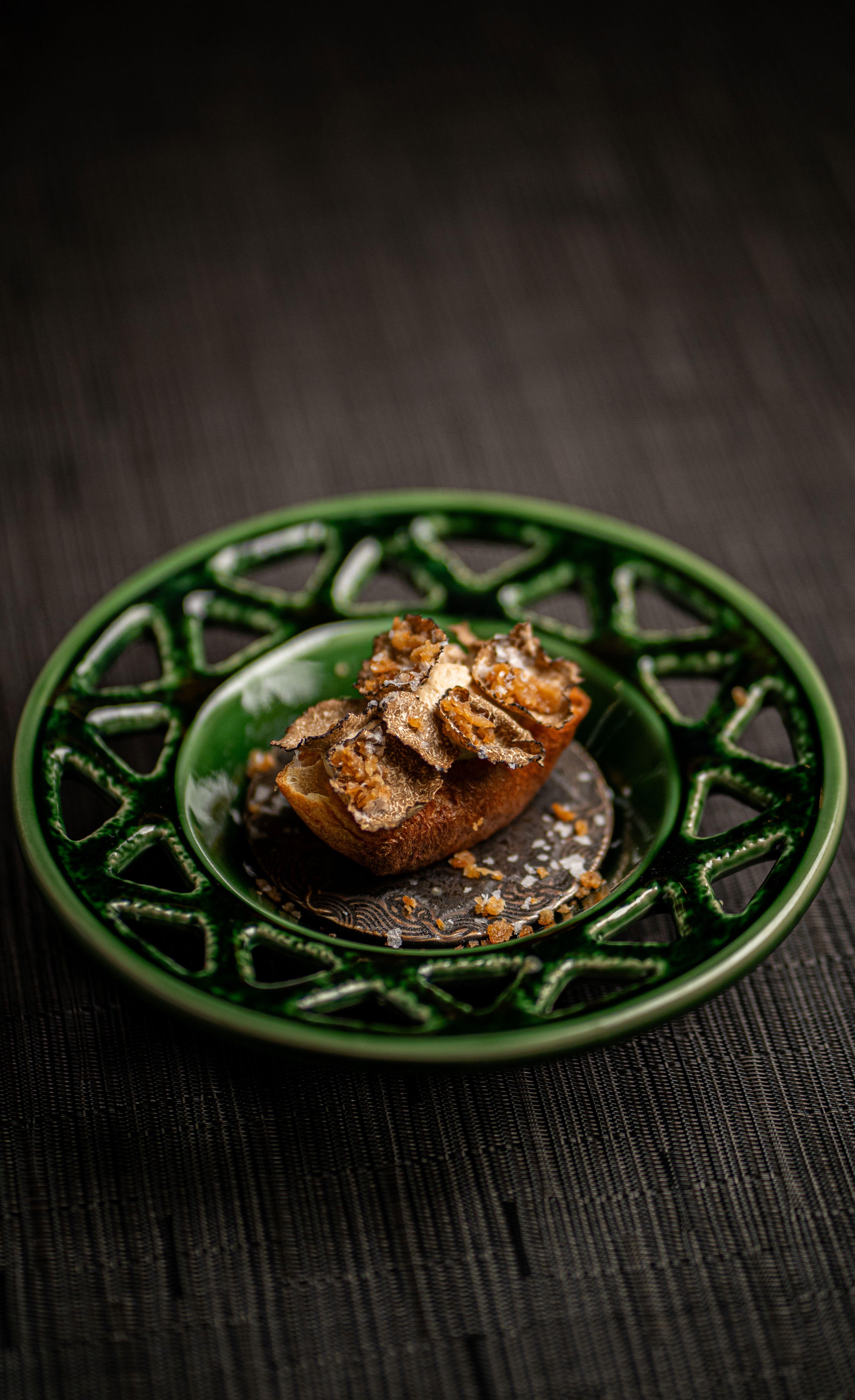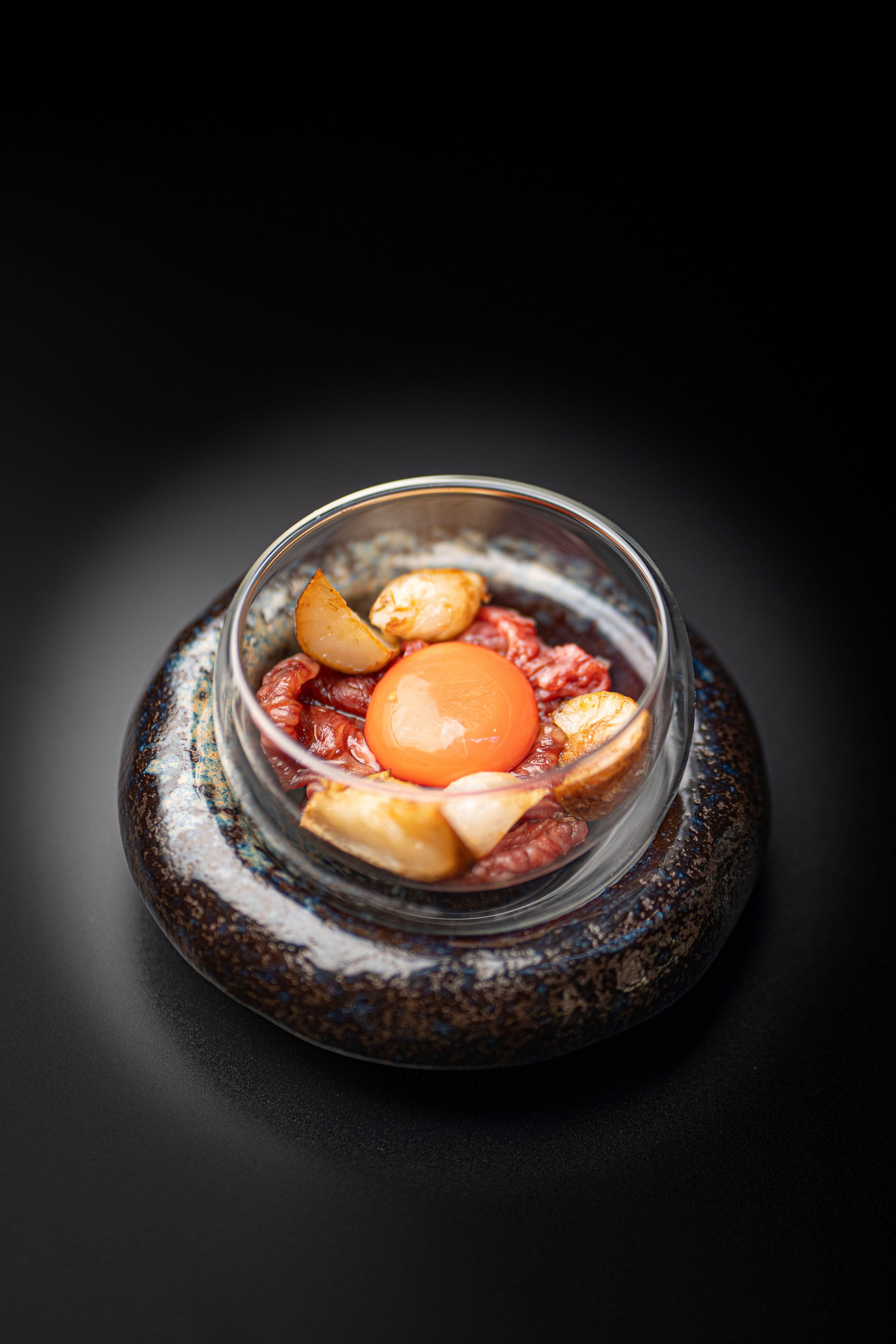 餐廳菜單不時會轉換款式,今個季度,餐廳用上日本、英國、法國等地的特色食材和烹調手法,呈獻限定豪華嚐味套餐,價錢由988起,即可品嚐十道Fusion菜式,部分使用驚喜神秘食材,到底是什麼?留待客人親自到餐廳開估!前菜方面必食小鉢三味,分別為意大利神秘食材鱈場蟹、日本和牛他他鵪鶉蛋及木之芽三文魚子鮑魚,特別推介木之芽三文魚子鮑魚,磯煮鮑魚撻上放上經日本清酒浸泡的三文魚子,鮮味香濃,份外開冑。另外北海道馬糞海膽炙燒神秘食材口感層次豐富,主廚用鹽麴慢煮神秘食材,再配搭鮮甜甘香的北海道馬糞海膽及香脆百頁腐皮,三種口感在口中交融,令人印象深刻。