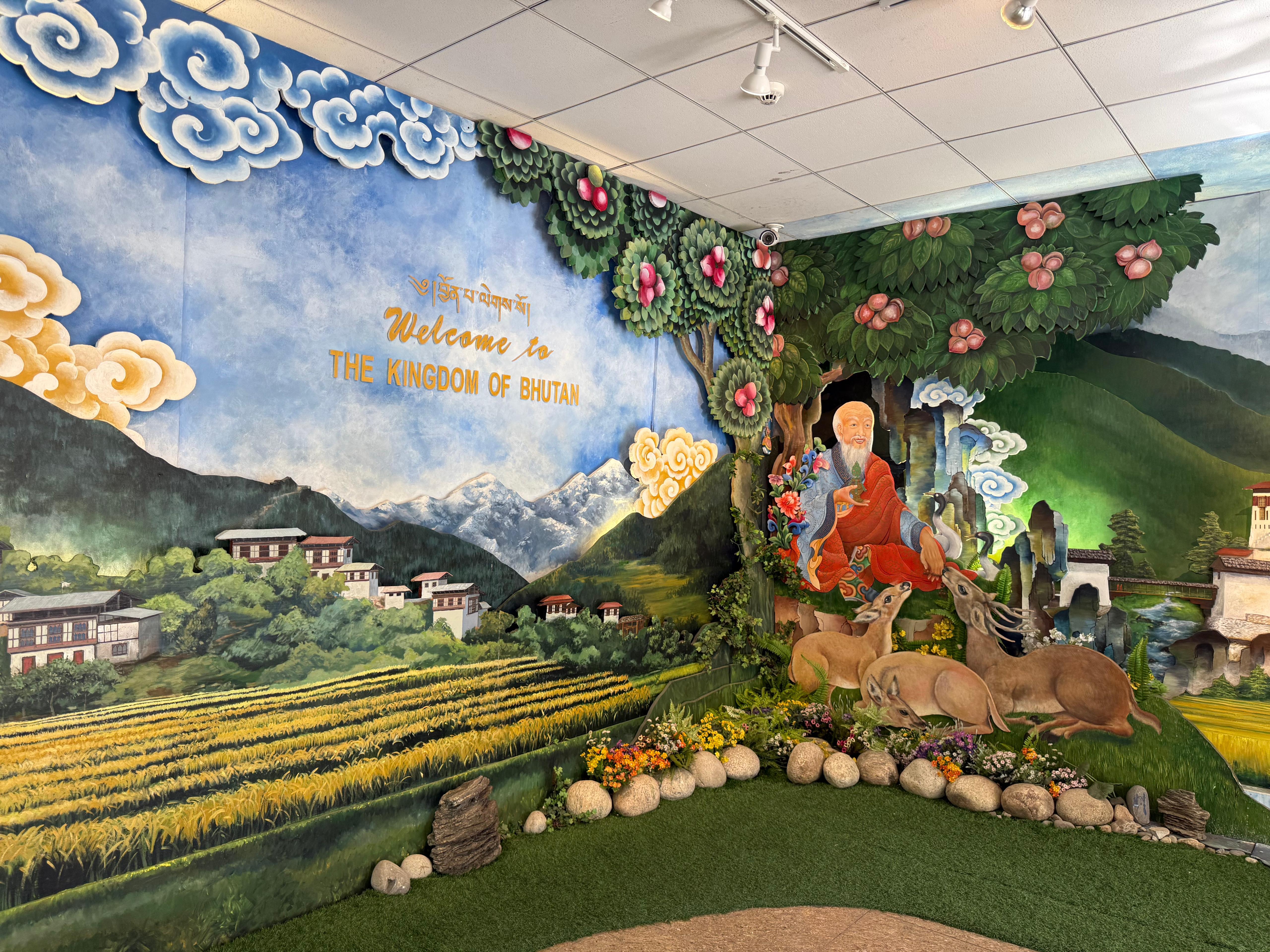 話雖如此,但其實這個機場其實充滿民族風情。首先建築外形融合不丹傳統木雕和彩繪等元素,並放上一幅現任不丹國王的全家福以作歡迎,所以每位旅客都會在這裡打卡留念。而走進入境大堂後,抬頭也可見到四幅皇室成員的肖像,可見這個國家對皇室的忠誠度。最後連拿取行李帶時都有驚喜,一座被譽為「幸福皇宮」的普那卡宗模型就處於行李帶中,為各位的旅程展開序幕。