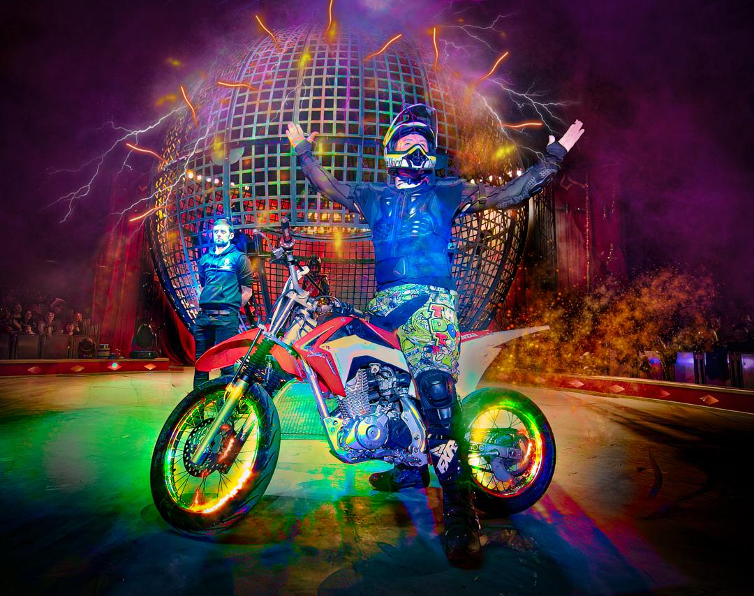 這是雜技團中最驚險刺激的表演之一。當騎師進入金屬網球體表面行駛時,會經歷到 3.5 至 5.5 倍的重力,等同真正地將自己的生命掌握於自己手中。使用輕量化的高扭矩 摩托車,以每小時高達 40 英里的速度,從而能夠在球體內完成迴圈。