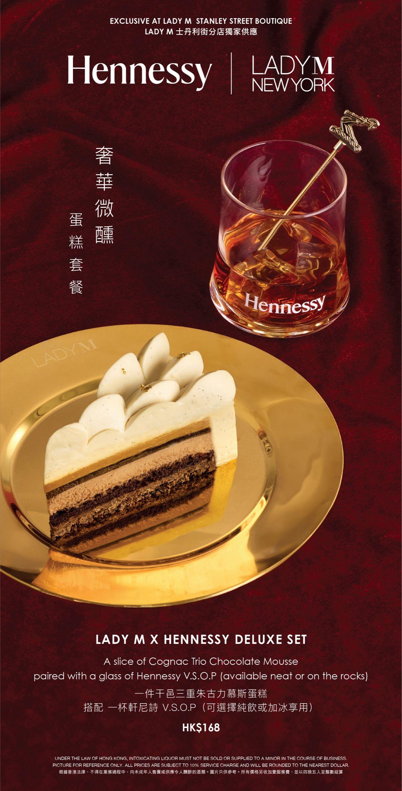 1.顧客可於 Lady M 中環史丹利街分店以港幣 168 元享用獨家「Lady M x 軒尼詩套餐」,套