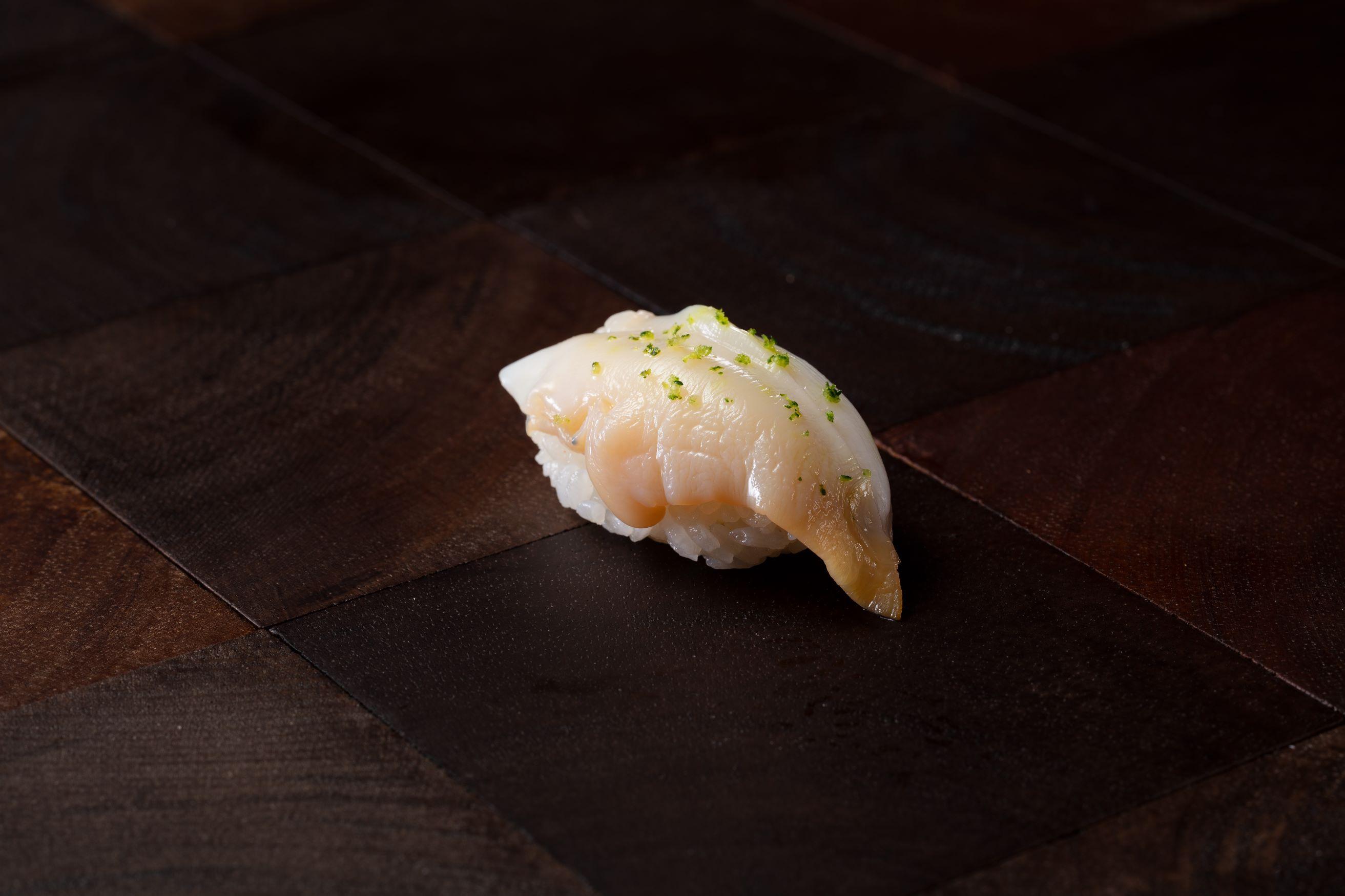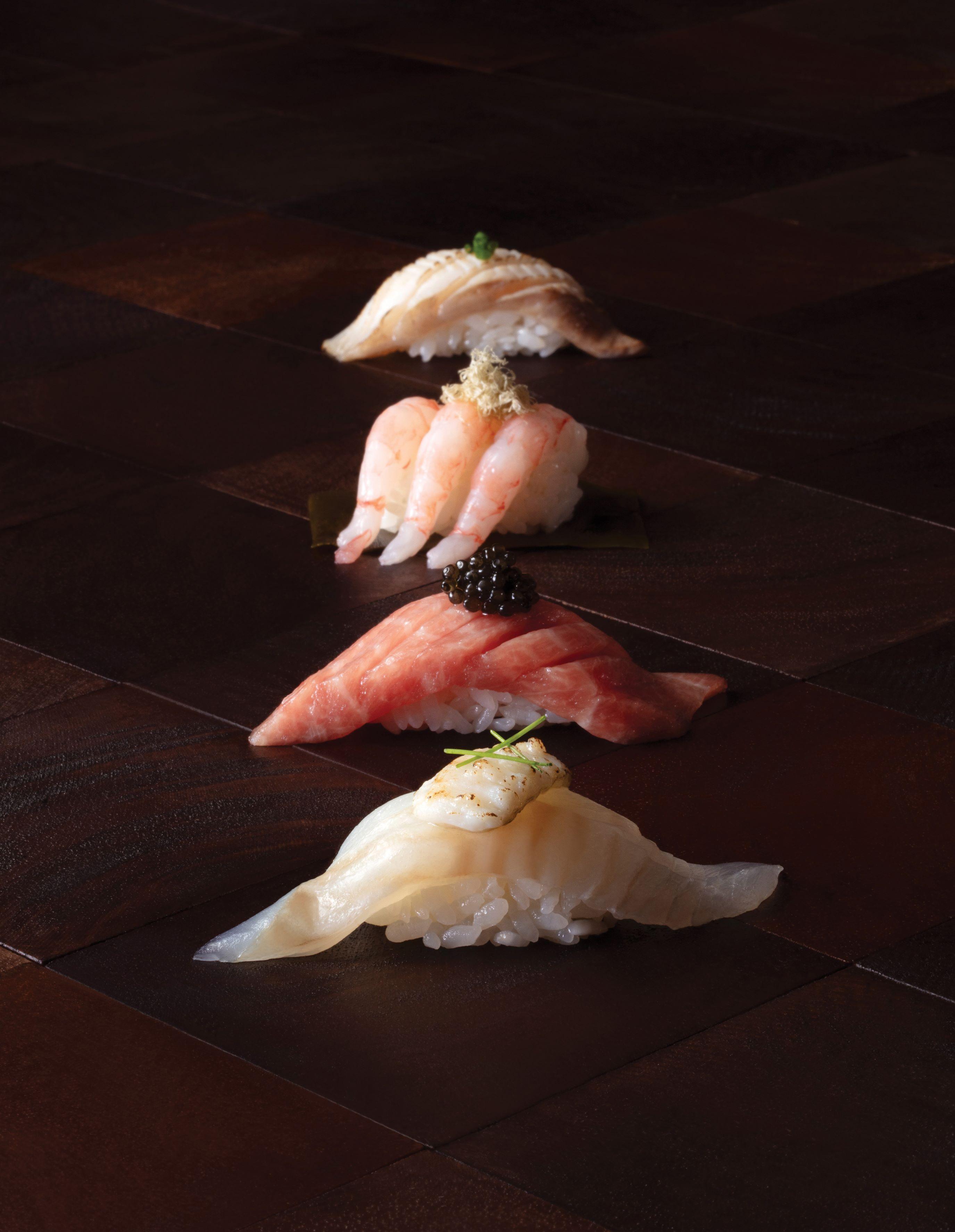 是次餐目以時令水產為主,其中包括加拿大產松葉蟹及銀鱈魚、地中海產大吞拿魚腩及俄羅斯產甜蝦等,配上各種特色醬料作提味,將口感及味道推至另一層次。松葉蟹腳伴醋啫喱壽司及炙燒厚切銀鱈魚壽司均用上自加拿大水產製作,松葉蟹腳伴醋啫喱 (加拿大產)($38/件),松葉蟹腳肉質鮮嫩,配上自家製蟹醋啫喱,酸甜醒胃,口感層次加倍。另一款職人壽司組合更矜貴,大吞拿魚腩配法國魚籽醬 (地中海產吞拿魚)($ 68/件),吞拿魚腩口感豐腴鮮嫩,與矝貴法國魚籽醬糅合,濃郁的鹹香鮮味令人一食難忘!記者心水推介入口滿滿魚油甘香的平目配炙燒裙邊 (韓國產)($28/件),平目魚肉質結實有彈性且油份豐富,職人在表面掃上昆布醬油及柚子皮,搭配入口即溶的灸燒裙邊,很有驚喜!