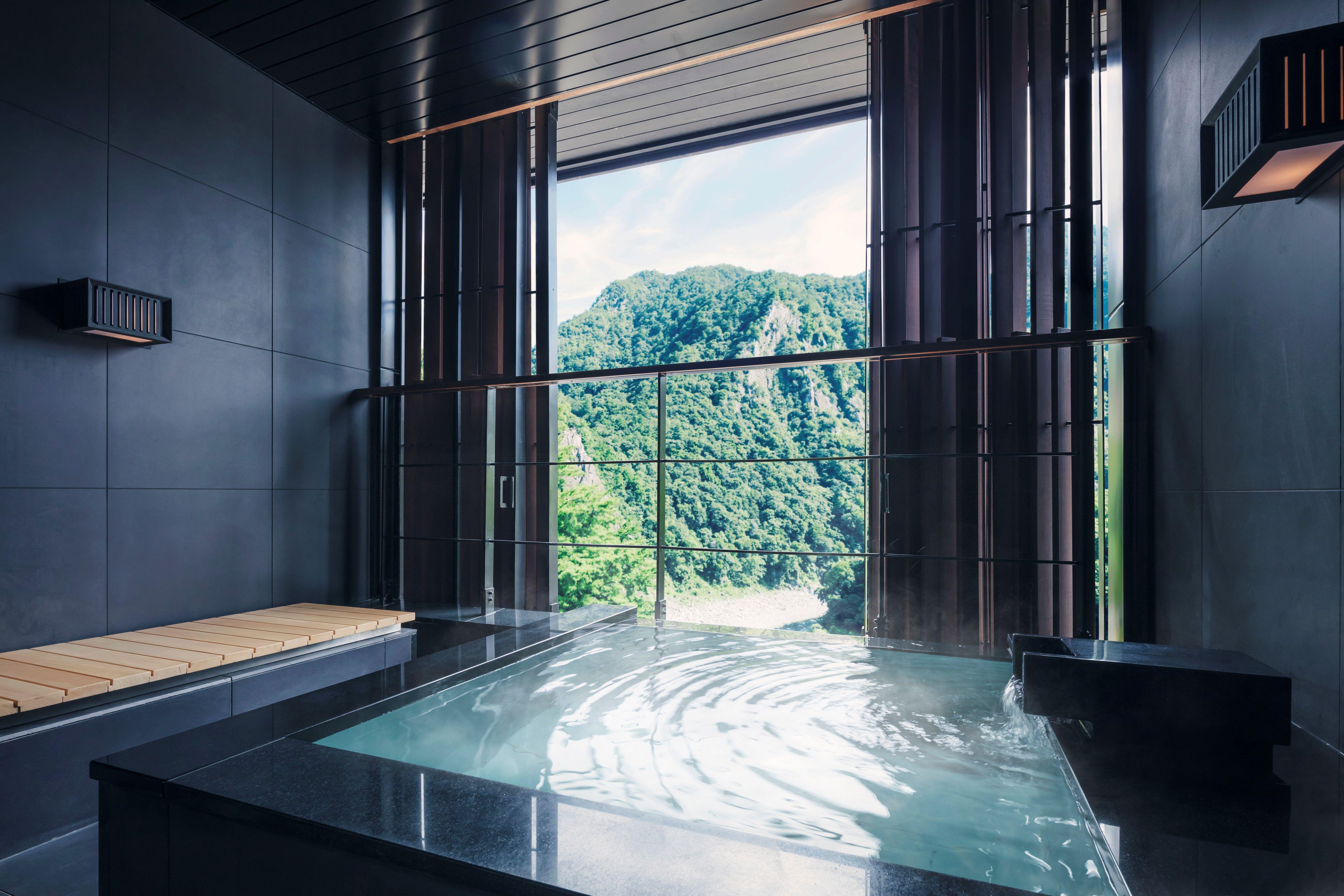 「虹夕諾雅 谷關」合共有五款房型,全館49間客房內均設私人半露天溫泉浴池,入住後可以獨享來自谷關深山內的天然溫泉水,私隱度高。今次記者試住的是「水明」套房,最多可供2人入住,818呎的房間以複式設計,劃分成上下兩層,一層為客廳、臥室、洗手間,一層則是浴室及溫泉浴池,配上全景落地大玻璃窗,面向綠意盎然的山景,不論是採光、景觀和空間感都是一流體驗。