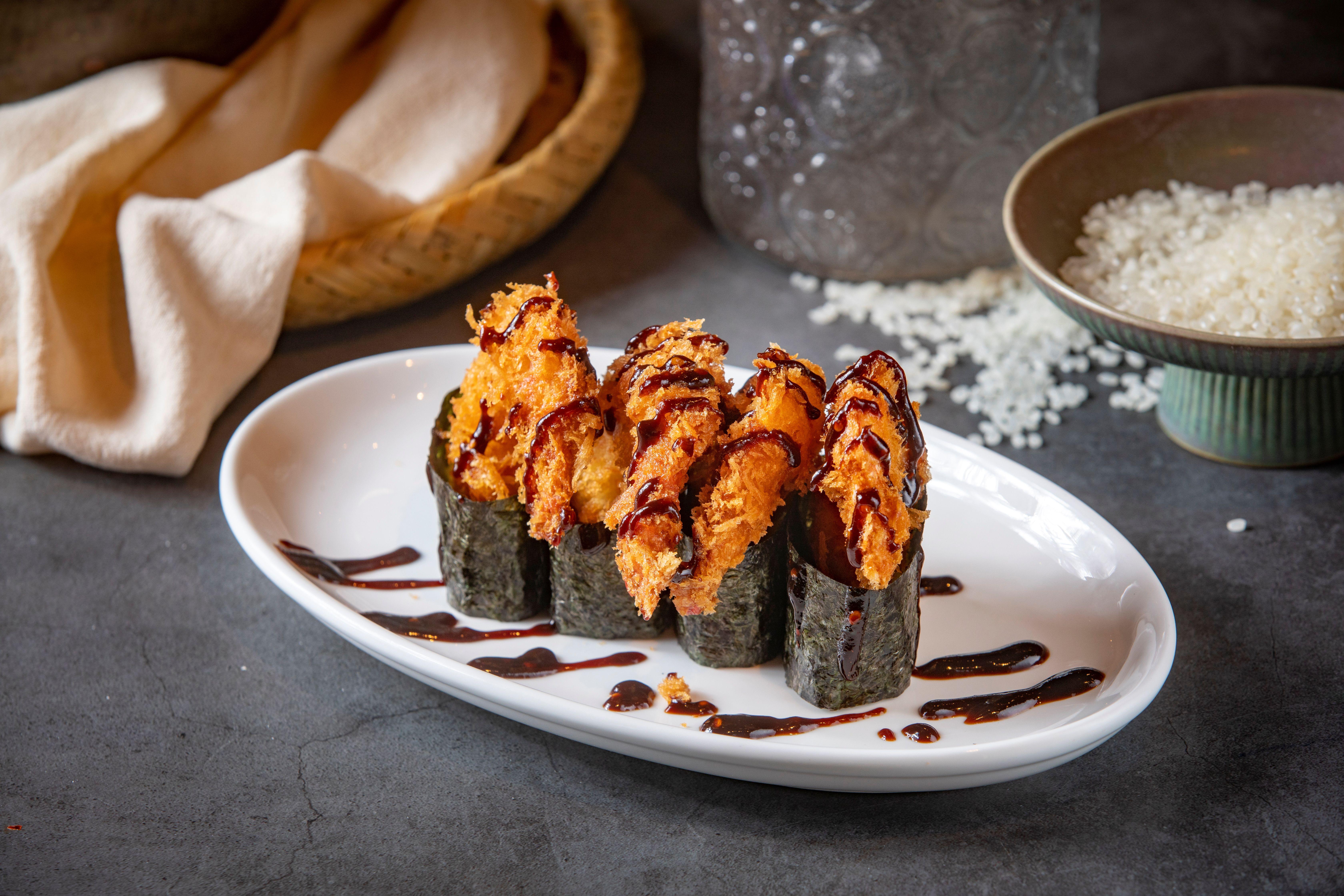 炸蝦天婦羅以名古屋吉祥物「金鯱」虎頭魚尾的外貌為靈感,鮮蝦裹上輕脆麵衣脆炸至黃金,搭配軍艦壽司,雙重口感滋味。