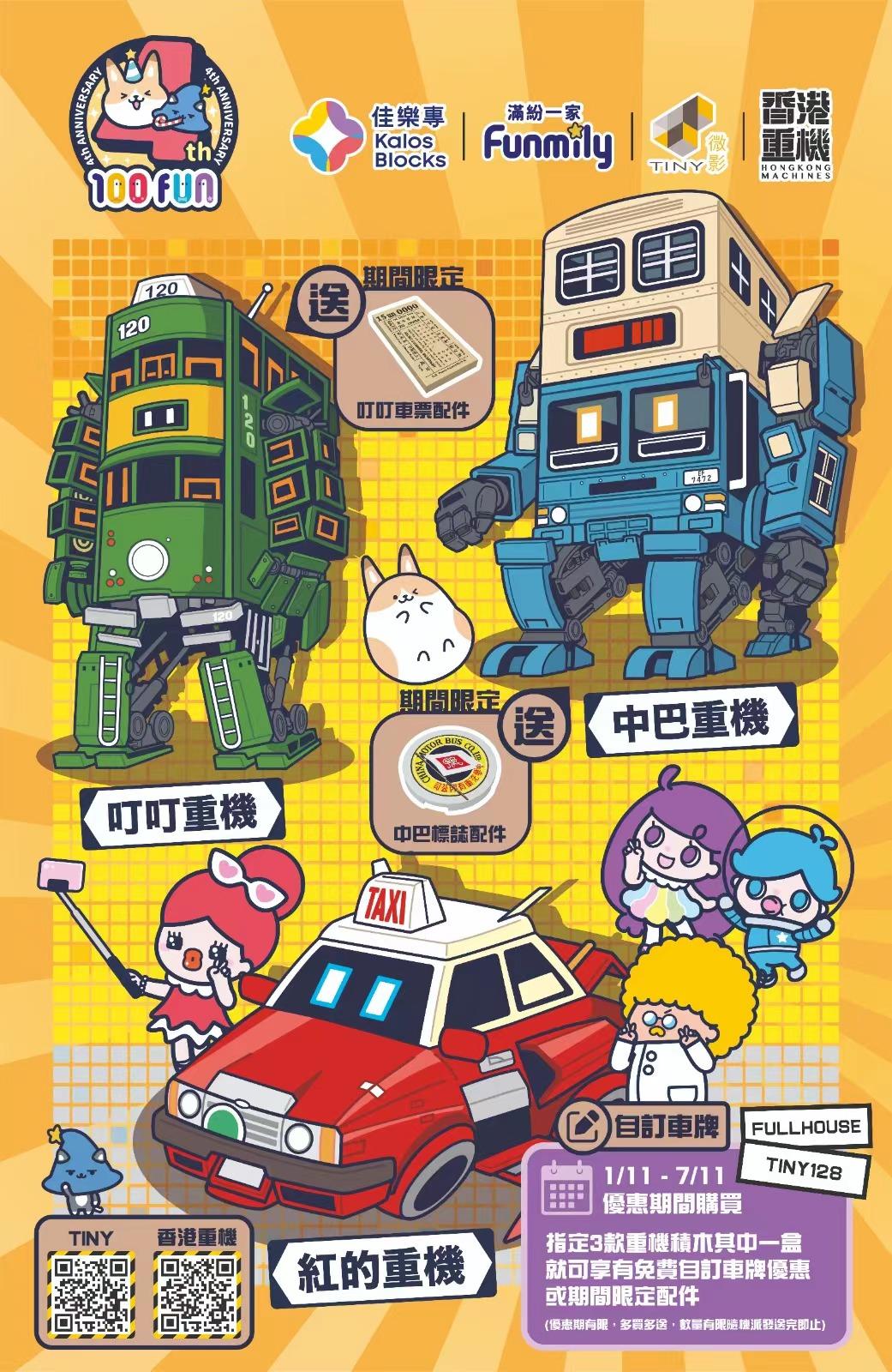 由 2023 年 11 月 1 日起至 12 月 17 日,Fullhouse World 滿屋世界 座落於樂富廣場三樓的 「100FUN 樂滿紛」將推出一系列 <<Hong Kong Machine 香港重機 X Kalos Blocks 佳樂專積木產品系列>> 相關主題的限定產品、場地裝置、樂園活動及配套小食,而萬眾期待的 <<Hong Kong Machine 香港重機 X Kalos Blocks 佳樂專積木產品系列>> 第一彈 – 巴士重機,電車重機及的士重機 ,將於 2023 年 11月 4 日下午起開始公開發售。