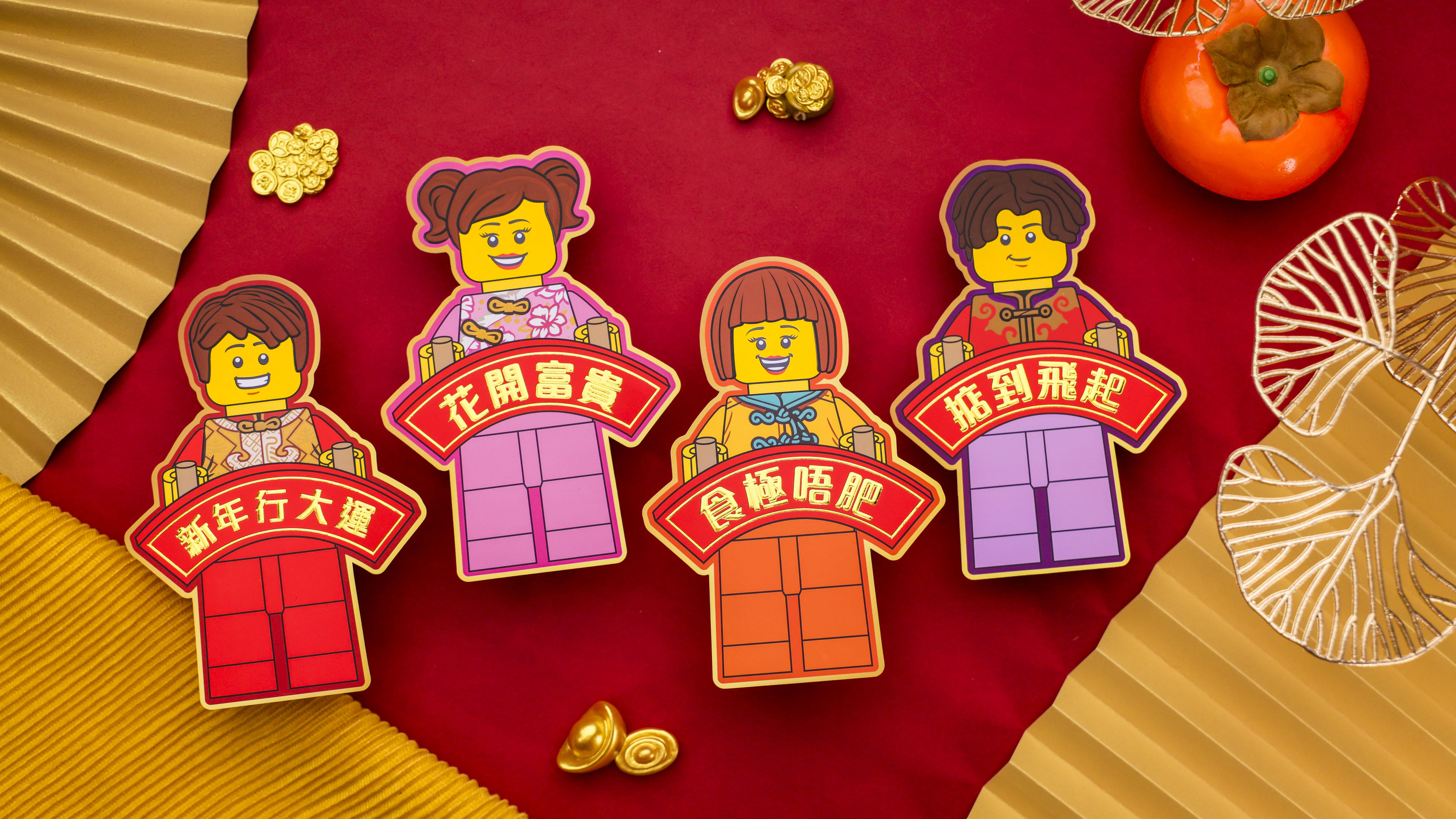 4款不同的樂高人仔換上不同賀年服裝,髮絲及中式服飾中扭結及領口位置均特別配以浮雕效果,讓利是封倍感精緻立體。同時,樂高人仔手持不同祝福語,特具本土特色,當中包括「掂到飛起」、「食極唔肥」、「新年行大運」及「花開富貴」,送上窩心祝福。 H.COINS會員於場內以電子貨幣消費滿HKD688,即可換領一套四款,共八個利是封。掃描利是封背面的二維碼,更有機會贏取商戶新春優惠。