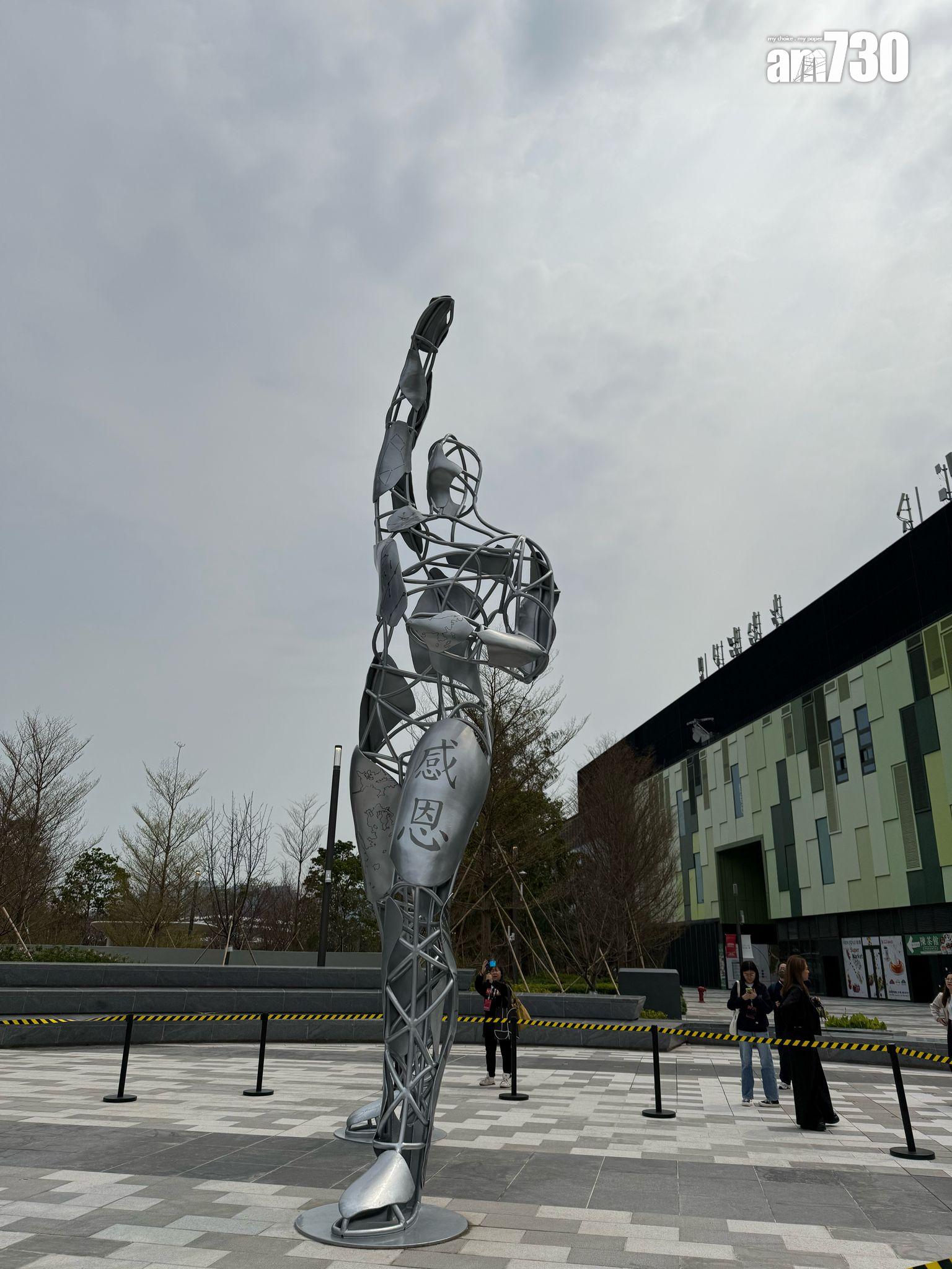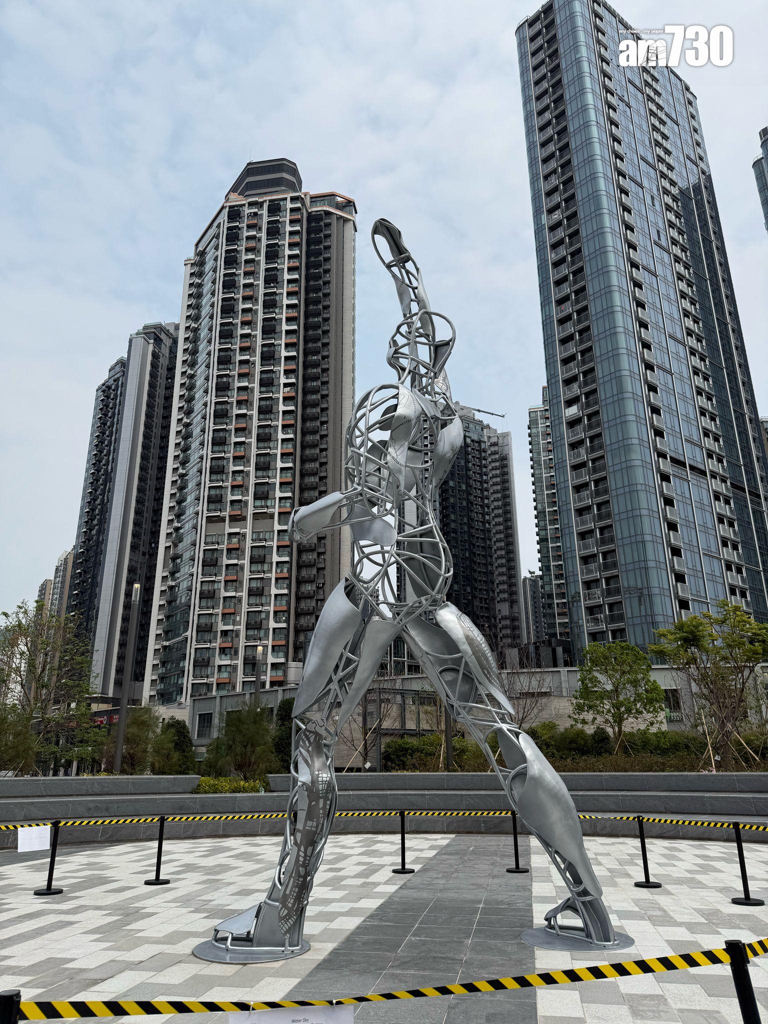 設於體育園主要入口的8米高雕像《水連天》,雕像刻上象徵城市變遷的地圖及漢字「感恩」及「水天」,代表期望體壇發展與天空般遼闊。雕像擺出的勝利姿勢,同時展示香港運動員追求突破的精神。
