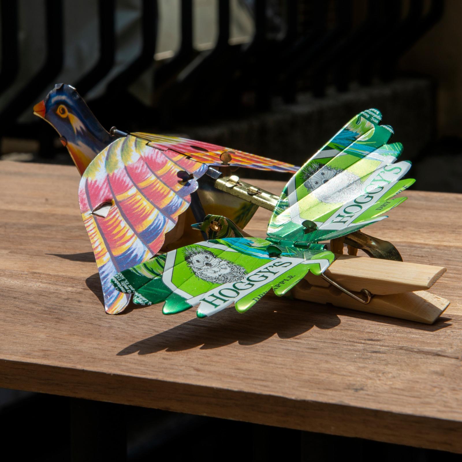 由Kevin Cheung設計的環保DIY材料包,利用廢棄飲品罐製作成可動的雀仔玩具。