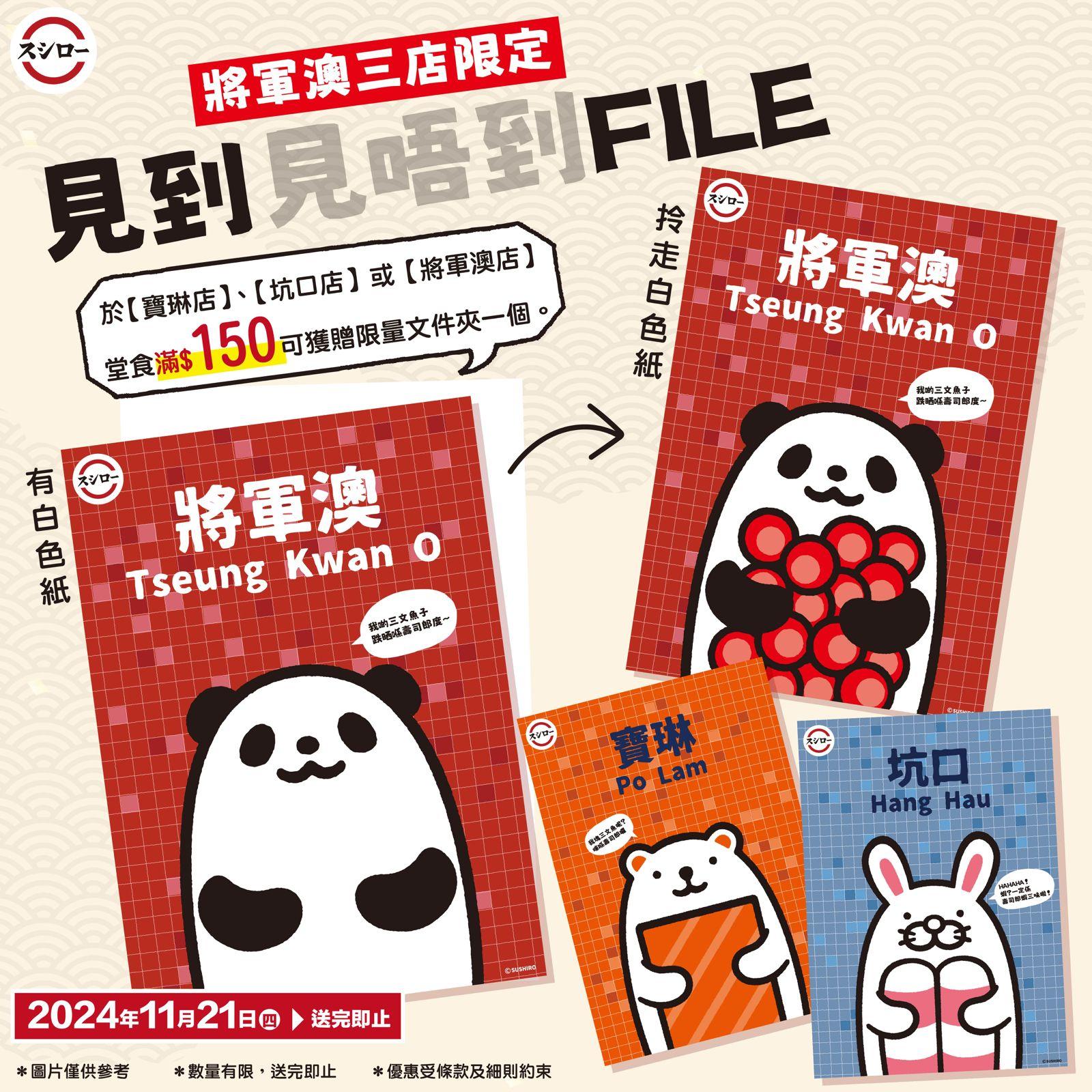 由11月21日起,「第一彈」優惠將以優惠價$27推出限定人氣4貫盛合登場,一碟有帆立貝、比目魚、赤蝦和三文魚,CP值爆燈!另外北海道粟米忌廉可樂餅亦只賣$10,相當抵食!而在11月28日「第二彈」優惠緊接推出,3款人氣壽司一律$10,分別有壽喜燒牛排、太刀魚及赤蝦,總有一款合你心意。另外,堂食用餐滿$150或以上還送「萌抱壽司限定文件夾」*乙個,三間分店的款式都不一樣,將軍澳店款式為三文魚子熊貓,寶琳店款式為三文魚小白熊,坑口店款式則是鮮蝦小萌兔,大家一於把握優惠機會食壽司及換領免費精品!