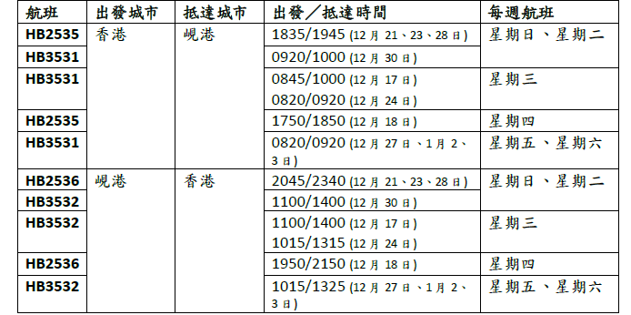大灣區航空的香港—峴港季節性航班詳情