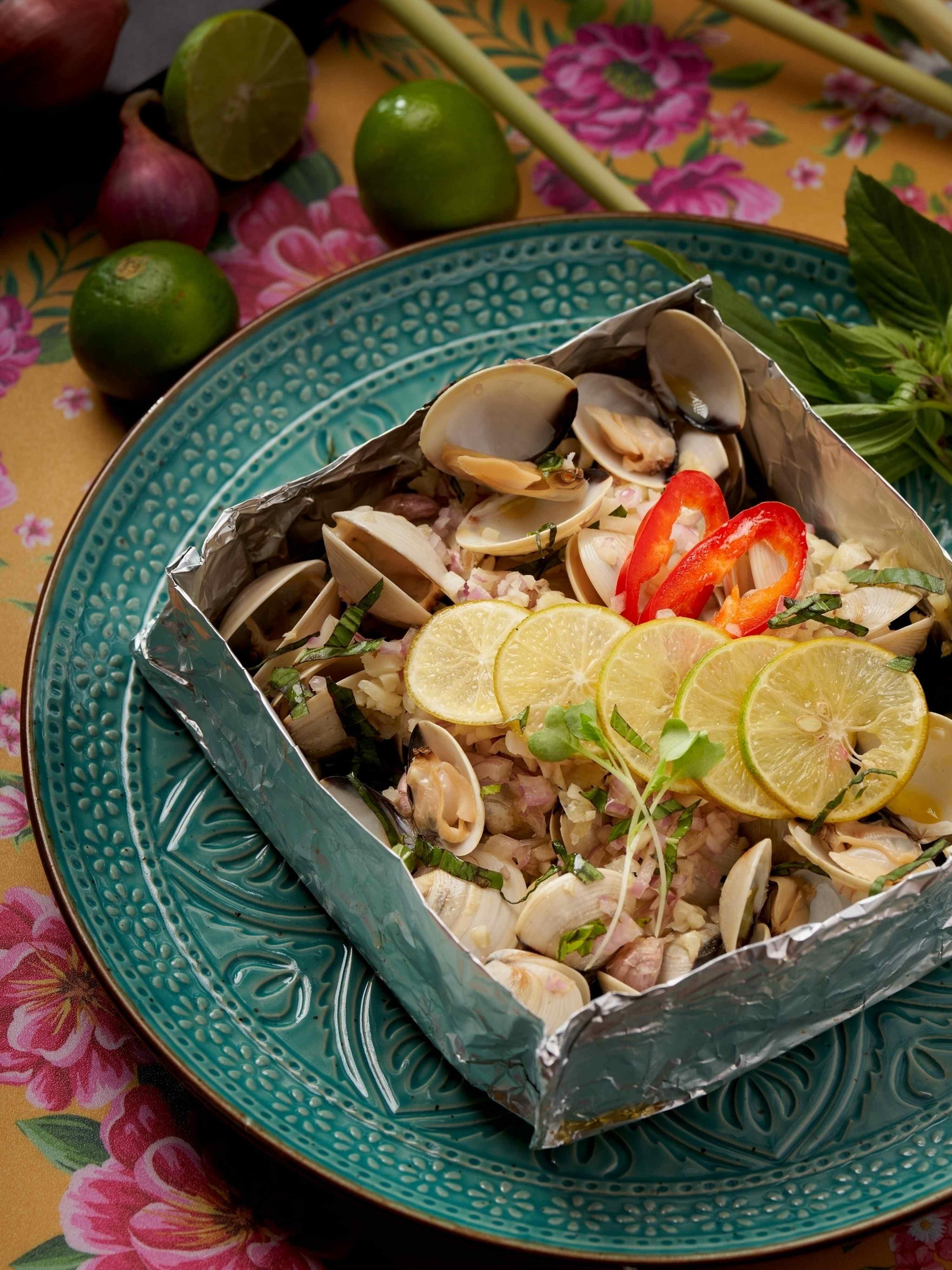 香港人嗜吃海鮮,在深受歡迎的香辣燒魷魚筒海鮮、白灼螄蚶配泰式海鮮汁以外,泰國菜少不了的生蝦刺身,也特別配上苦瓜作變奏,集酸甜甘辣於一身。蒜蓉辣椒卜卜蜆($88)靈感源自西式白酒煮蜆,在蕉葉、金不換、泰國芫茜、乾蔥等香草的襯托下,加上青擰及指天椒,以錫紙包裹去焗,蜆汁的鮮甜與酸甜香辣混和。