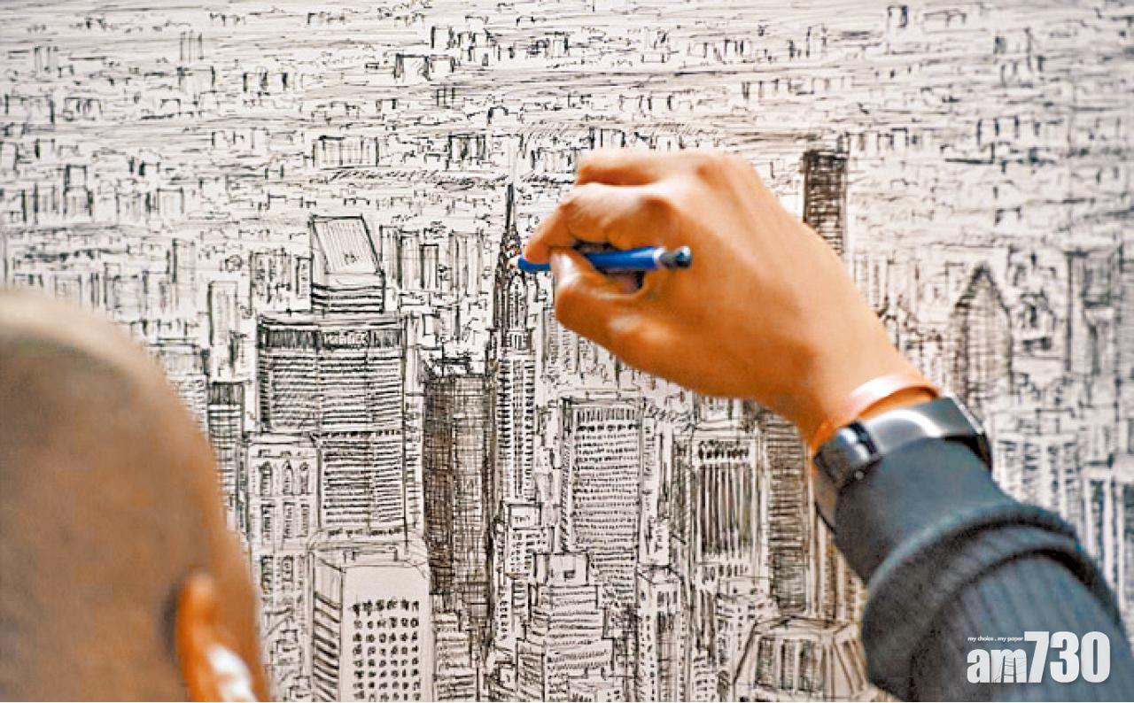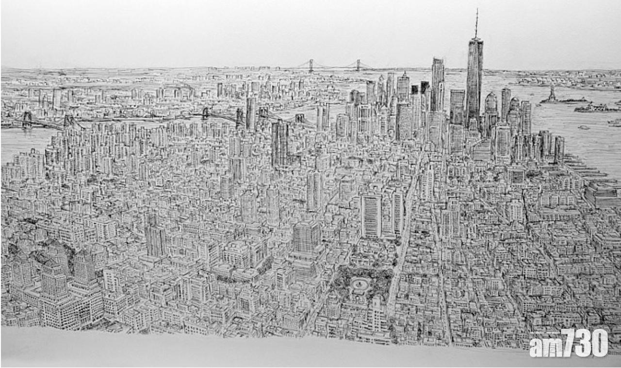 曾是天才神童、8歲獲英國首相府委任作畫的Stephen Wiltshire(圓圖),享負盛名後繼續以「神眼」獨步畫壇,憑驚人記將紐約鳥瞰圖細緻重繪的奇技,只是故藝重施,繼東京、馬德里、杜拜、耶路撒冷、悉尼、上海、伊斯坦布爾、墨西哥城及羅馬後又一傑作。這位獲英女王頒授大英帝國最優秀勳章的大師,上周三在曼克頓作45分鐘天際遊之後,近5米長的「闊銀幕」素描大作,周一已展於藝廊。下一站?大師尚待靈感指引。