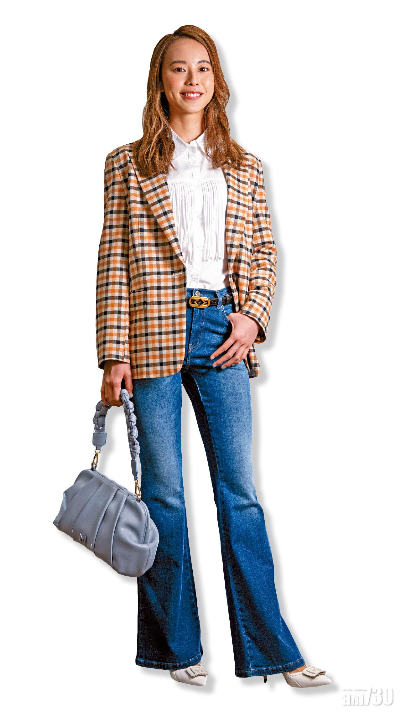 ‧杏橙色格紋blazer $4,680(D)、 ‧白色流蘇shirt $2,180(D)、 ‧藍色洗水boots cut jeans $2,580(D)、 ‧黑皮金扣belt $780(D)、 ‧粉藍色皮革hand bag $1,380(D)、 ‧白色high heels $2,480(D)
