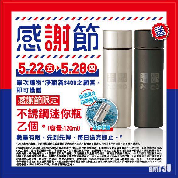 單次購物淨額滿$400之顧客,即可獲贈感謝節限定不銹鋼迷你瓶一個 (容量120ml)。