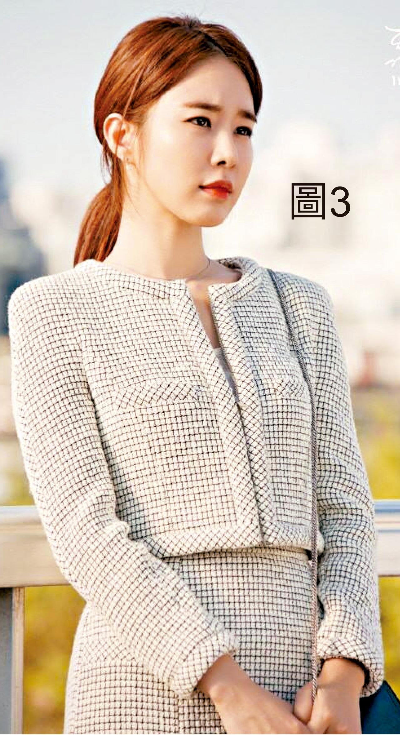 著套裝時(圖3),可模仿老闆娘這種格仔或壓紋款式,會增添高雅感,再用金屬鏈帶手袋,就能變身做型格有個性的OL。