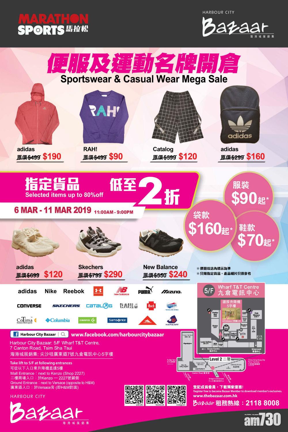 春天到又要換新Look,想變裝變得精明,就要留意由今日開始到本月11日海港城展銷集嘅馬拉松便服及運動名牌開倉!指定貨品低至2折,服裝$90起、鞋款$70起就有交易,買多幾件新裝替換絕對唔肉赤!唔好以為價錢咁平就係不知名牌子,adidas、Nike、Under Armour、New Balance應有盡有,有興趣就要快手去掃平貨!