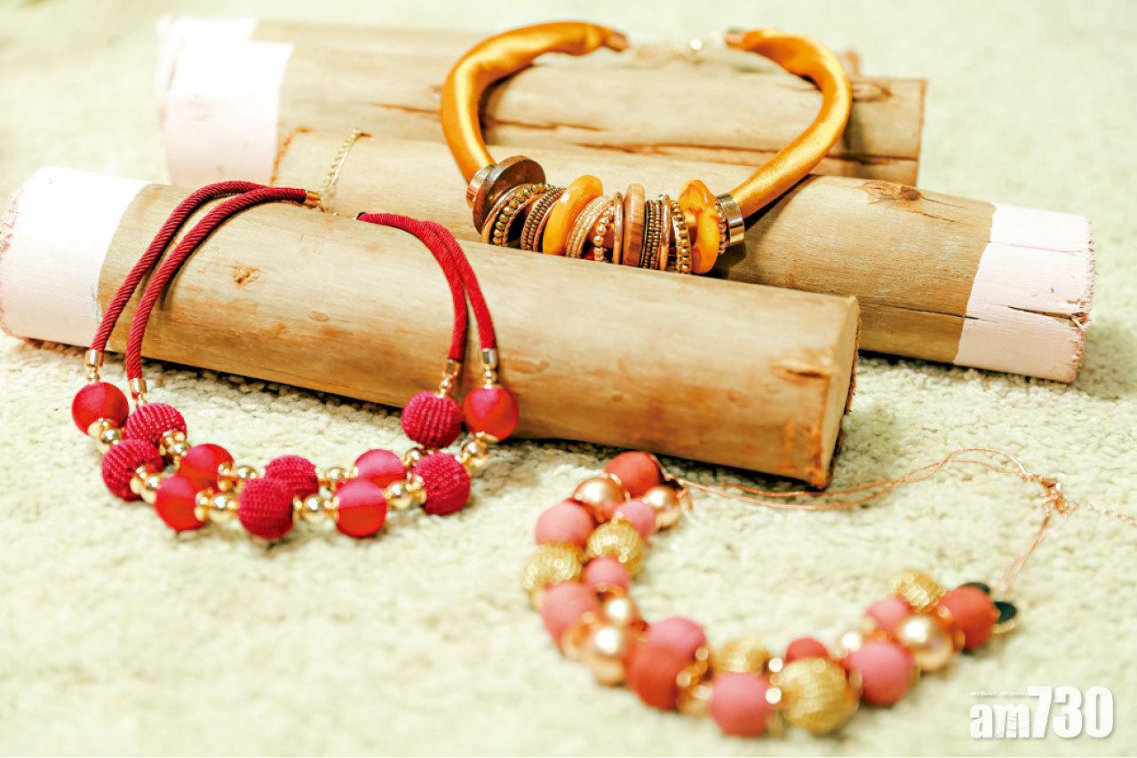 (左)紅色民族珠仔款頸鏈 $240 (a); (中)芥辣黃民族閃石款頸鏈 $210 (a); (右)粉紅x金色珠仔頸鏈 $240 (a)