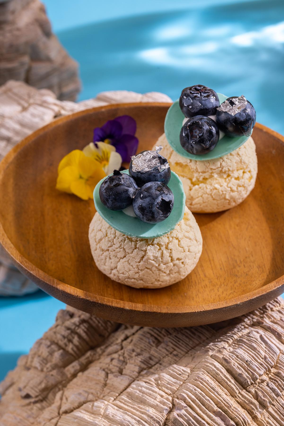 甜點:蝶豆花草莓戚風卷、朱古力棒、藍莓忌廉泡芙、馬卡龍、雜莓撻。