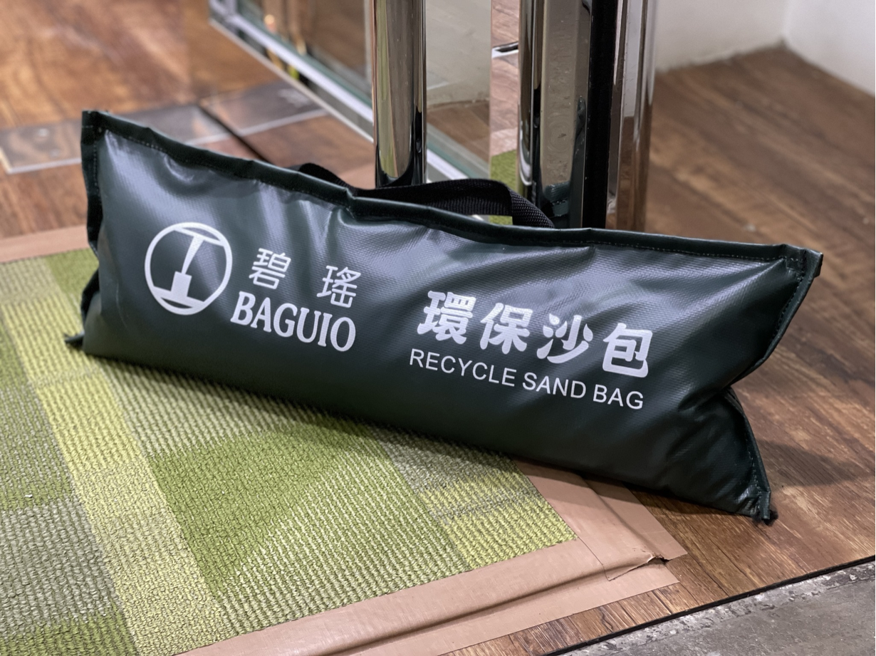 以使用過的帆布和經過處理的玻璃砂,由庇護工場學員親手製作的環保沙包。