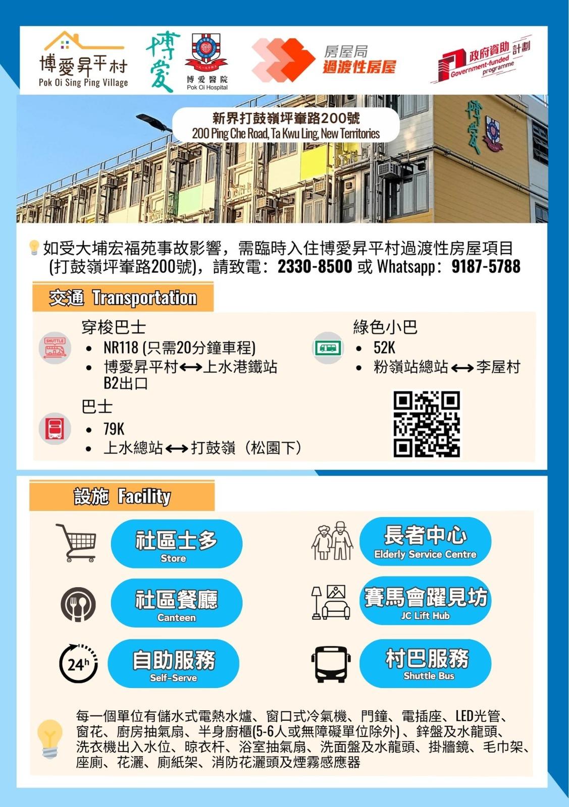 過渡性住房:為有需要居民安排入住「博愛江夏圍村」及「博愛昇平村」,並豁免租金。