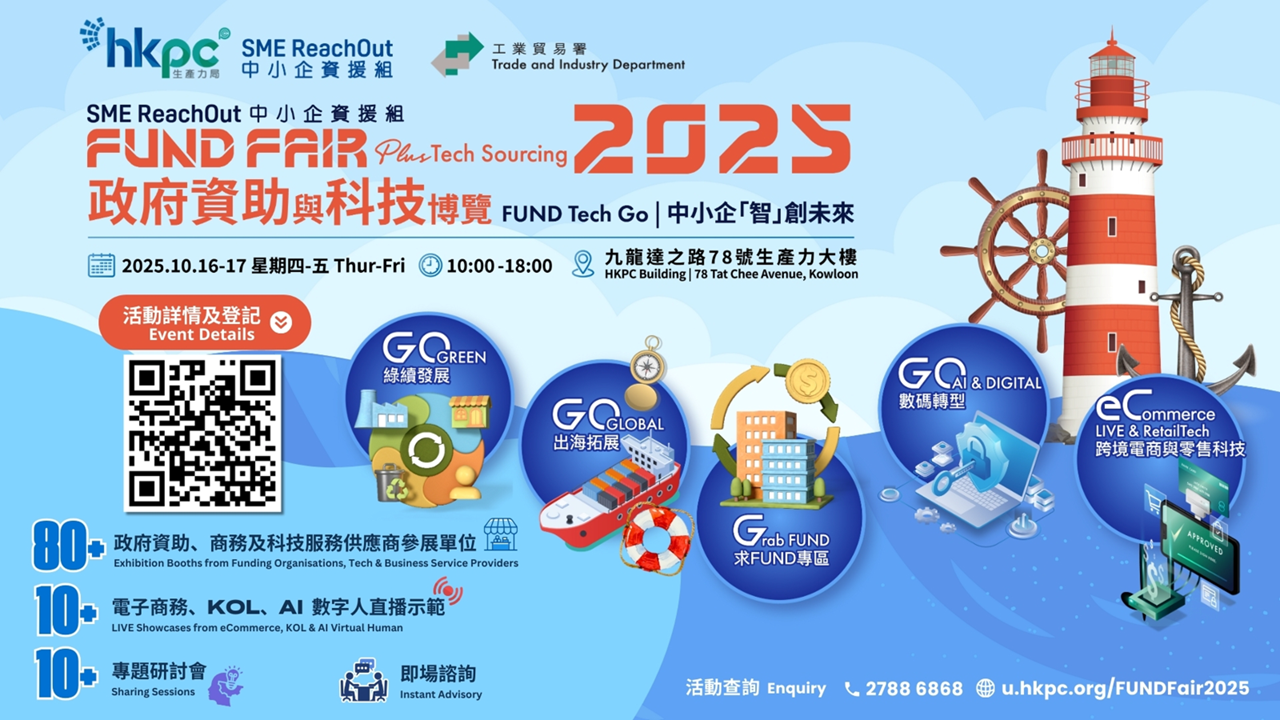 生產力局將聯同工業貿易署,於101617日假生產力大樓合辦年度旗艦活動「中小企資援組:政府資助與科技博覽2025」。本屆博覽會以「中小企『智』造未來」為主題,旨在為本地近36萬家中小企提供一站式資源對接平台。博覽會將匯聚超過80個來自政府資助部門、科技服務供應商及行業機構的展位,協助企業把握「出海」、人工智能(AI)、數碼轉型、跨境電商及知識產權(IP)等發展機遇。今屆博覽會將設五大主題展區——包括求FUND專區、出海拓展、綠續發展、數碼轉型及跨境電商與零售科技,並聚焦於AI、新零售科技及 IP品牌三大新興焦點。