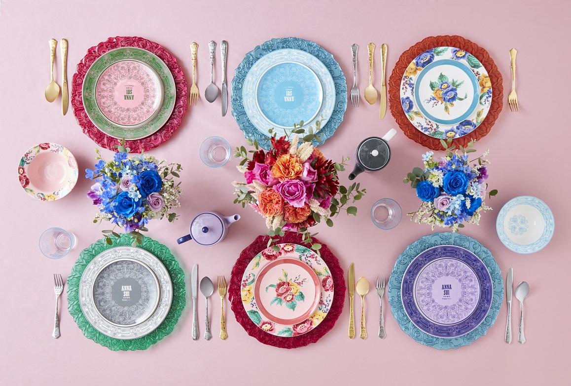 餐桌用品包括多款碟子、碗、馬克杯、茶壺、杯碟套組及高腳杯等,飾以華麗花紋,以ANNA SUI風格用色作不同設計,玻璃碟更可當裝飾用,增加家居裝飾及用餐樂趣。