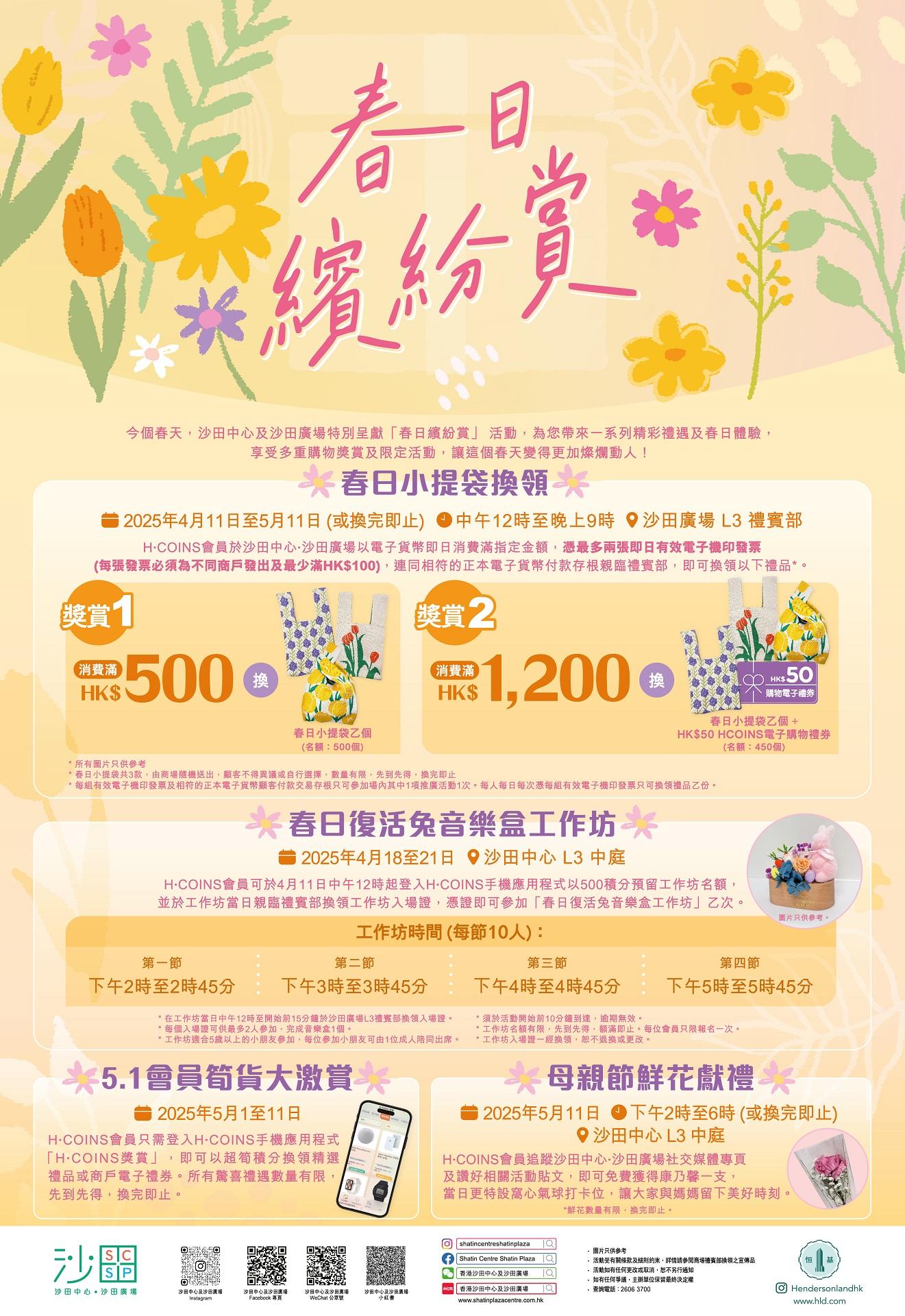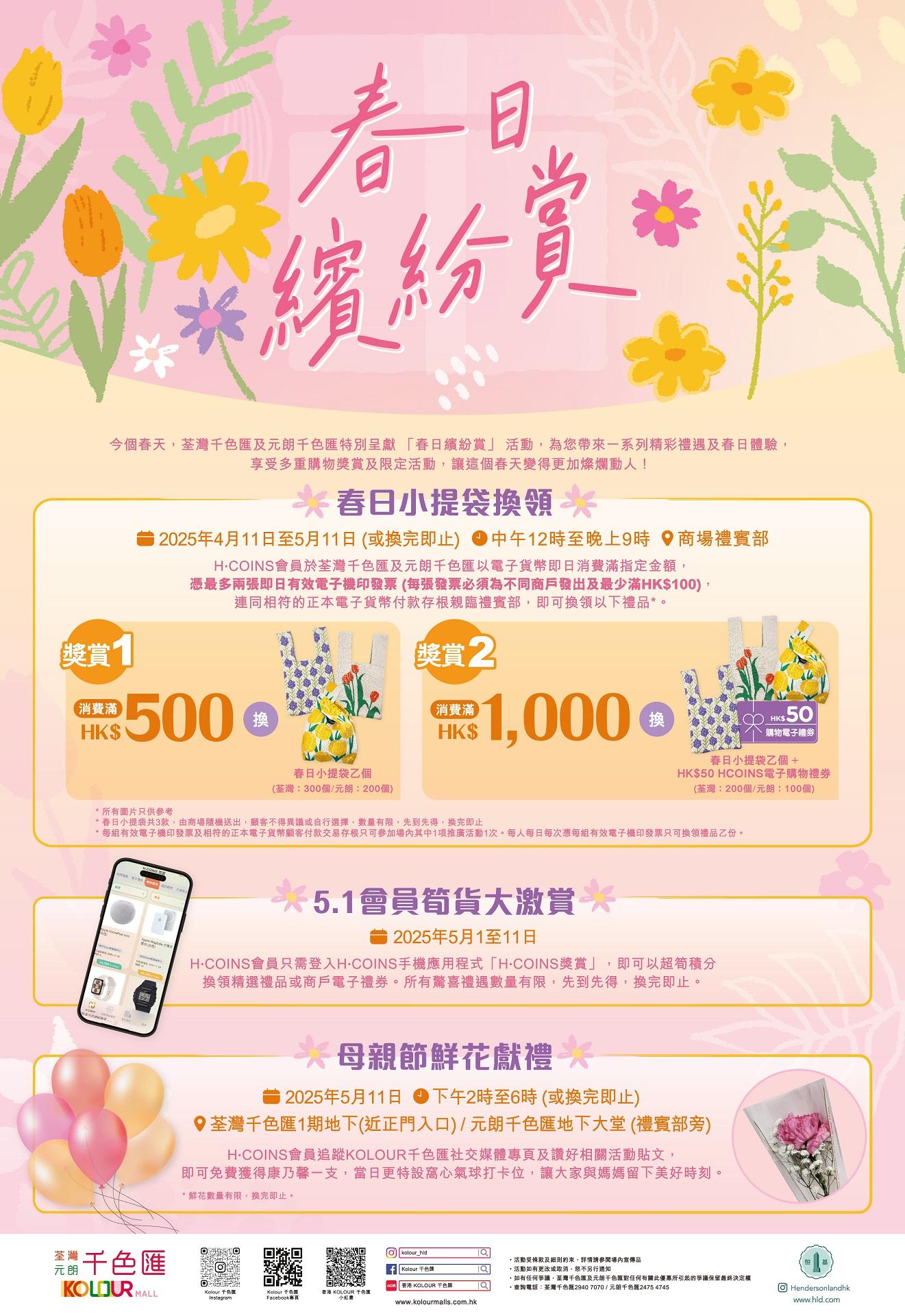 春天到來,恒基地產旗下KOLOUR千色匯、沙田中心及沙田廣場即日推出春日繽紛「賞」,帶來一系列購物優惠與春日體驗,除了有必搶春日小提袋,更送上會員快閃多重優惠,更為各位媽媽送上母親節康乃馨,即睇詳請。