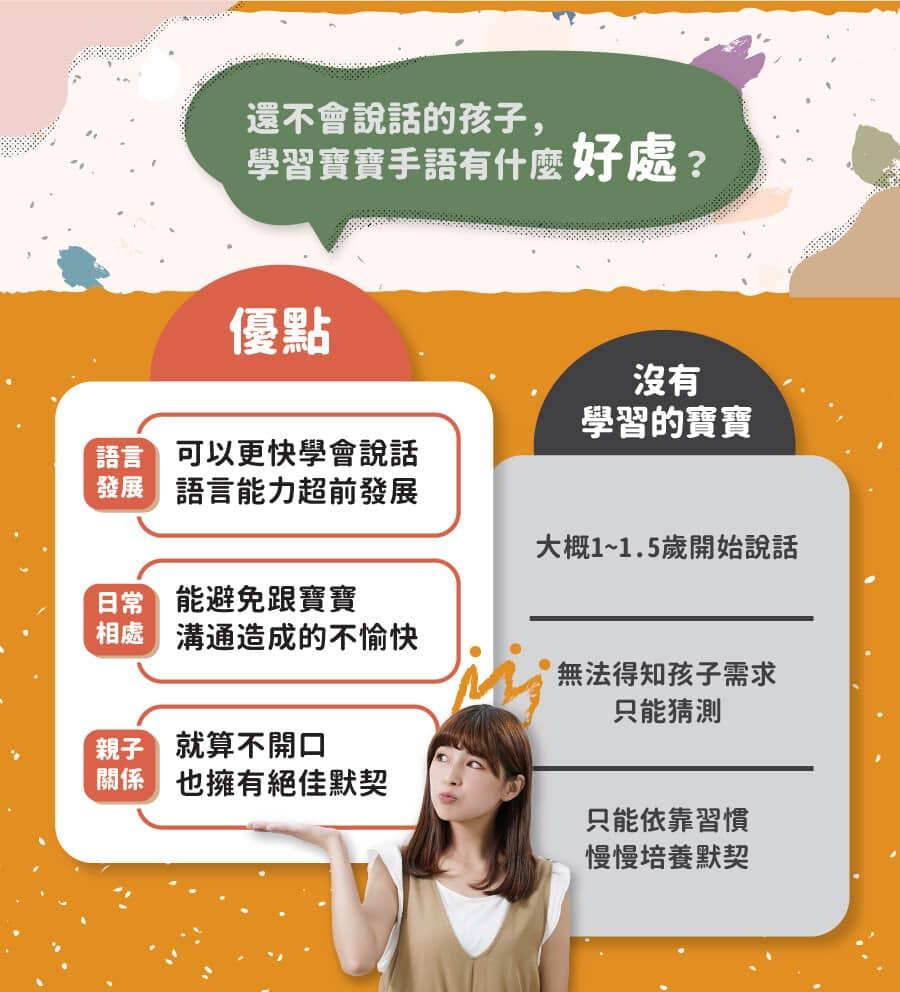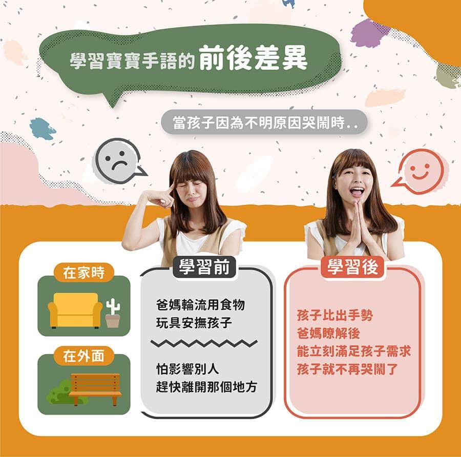 嬰兒手語是目前美國最受歡迎的育兒方式。在小朋友仍未懂得說話時,教導孩子用簡單手勢來表達需求,孩子學會後就能用手勢和大人溝通;對於新生兒父母和懷孕媽咪來說,面對小朋友的哭鬧不用再猜測需求,能夠有更多時間好好跟小朋友相處。寶寶手語線上課程為6小時課程,分五大章節主題,會對手語動作詳細分解,讓小朋友跟家長輕鬆學會日常核心單字表達。