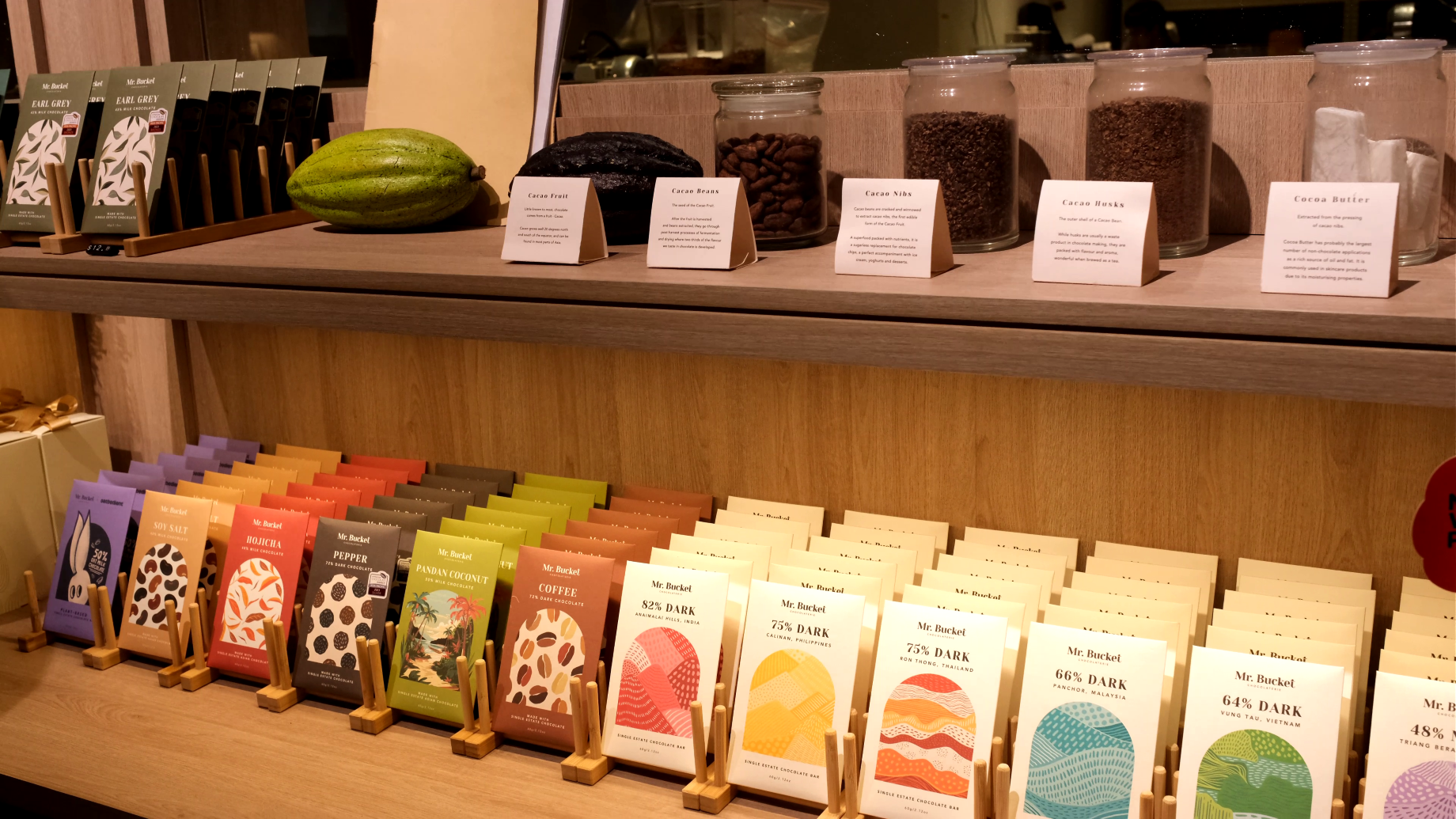 說回Mr. Bucket Chocolaterie朱古力工廠的品牌故事,品牌創立自2020年,名字源自於《朱古力掌門人》內的主角Charlie Bucket,主理人Jerome Penafort將父親的可可樹農場業務重新整理,集中製作手工朱古力,並找來來自馬來西亞、菲律賓、印度、泰國和越南的可可豆加工再出品,打造出屬於新加坡本地的朱古力品牌。朱古力工廠佔地逾5000多平方呎,門外走自然悠閒風格,天花掛滿不同顏色的可可掛飾,長廊放著梳化座位,吹著微涼風,陣陣東南亞熱帶風情。店舖一推門已嗅到空氣間彌漫甜美的朱古力香氣,店內設有開放式朱古力製作區、零售及堂食位置,總之所有出現的事物都和朱古力相關!