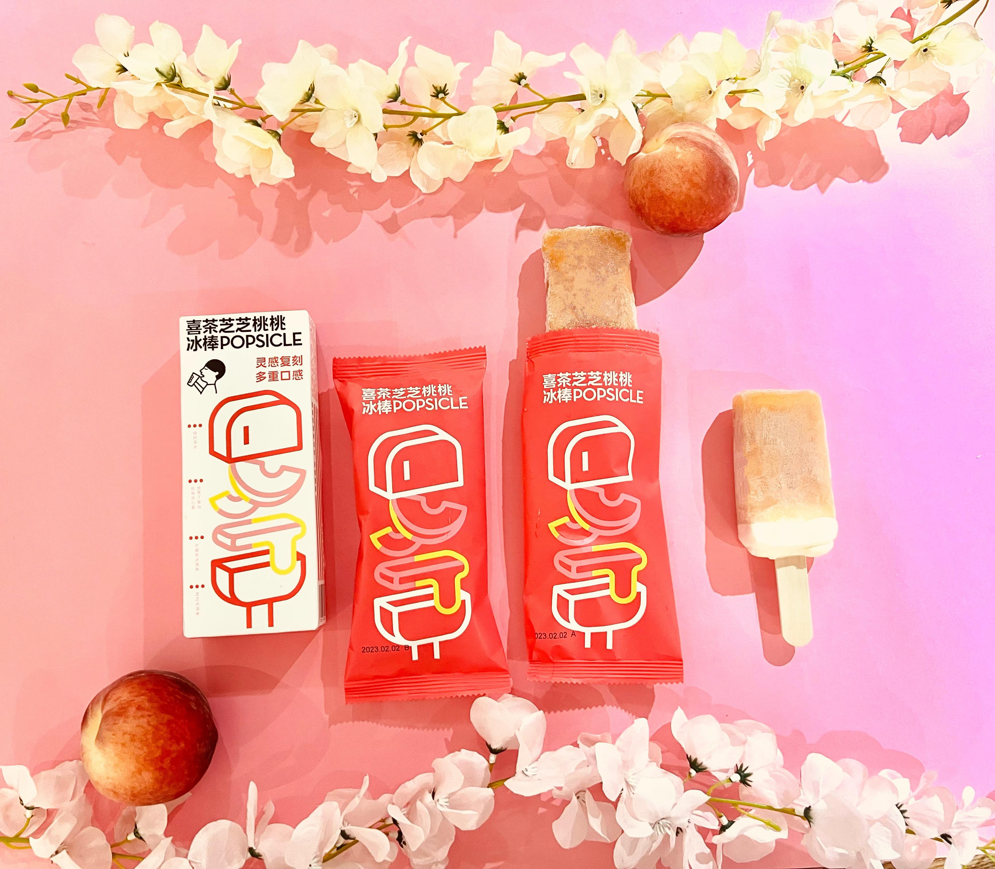 另一款「芝芝桃桃雪條」 同樣選用清新的綠妍茶製作茶冰,包裹綿密的蜜桃雪糕和爽脆的蘋果 粒,內餡層次豐富有口感,香甜的桃香與濃郁茶香完美配合。而雪條的尾部配以醇濃的奶蓋雪糕,誘人的蜜桃果香與海鹽芝士奶香交融,讓人一試傾心。