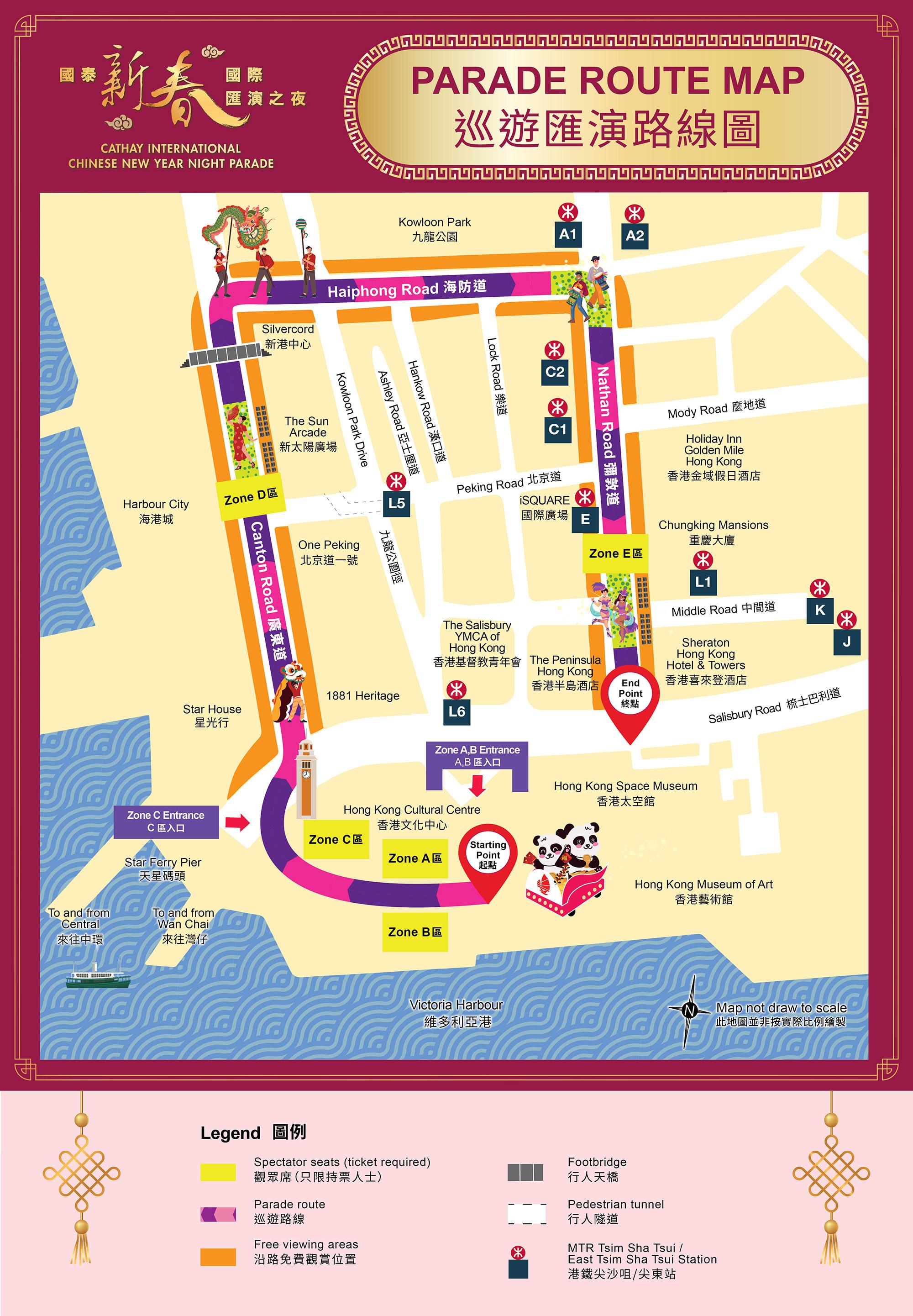 地點:尖沙咀(第一輛花車約於晚上8:30到達廣東道,晚上9:00到達彌敦道,最後一輛花車約於晚上10:30到達香港喜來登酒店終點)