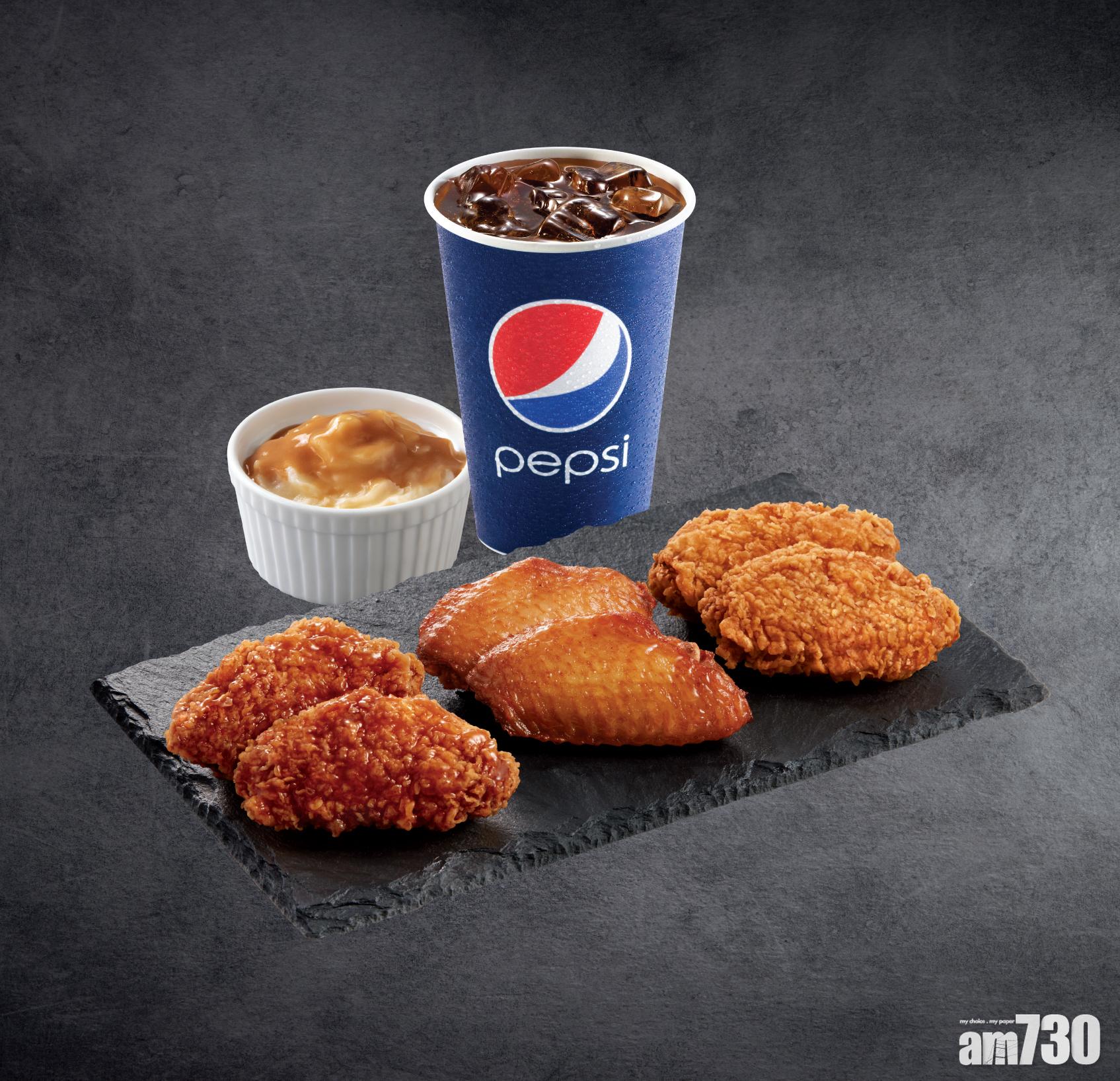 雞翼三重奏套餐包括2件巴辣香雞翼、2件蜜蜜燒雞中翼、2件秘製蝦醬雞翼、1客薯蓉(普通)及中杯裝汽水。$39