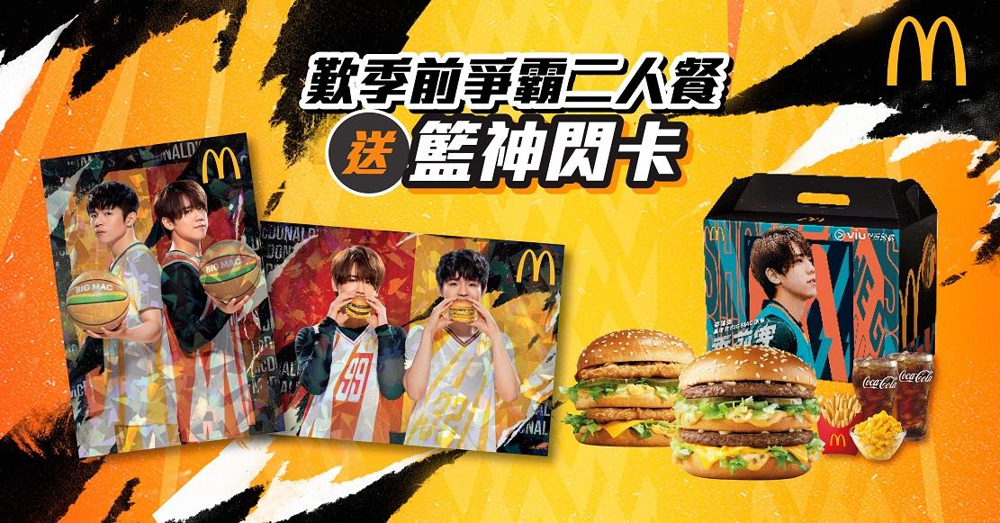 當然不少得兩位主角!粉絲們只需透過麥當勞App使用「季前爭霸二人餐」優惠,即可一次過成功收集2張「籃神閃卡」。而且二人餐以印有姜濤及Ian季前賽劇照的分享盒盛載,包括二份巨無霸或脆雞巨無霸套餐,或可轉配指定主食及加配優惠,歡迎大家與親友一起分享美味同時收集閃卡和季前賽分享盒,享受雙倍快樂!所有「季前賽籃神卡」及「籃神閃卡」均數量有限,送完即止。