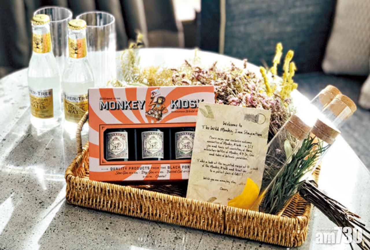 「The Wild Monkey Inn」住宿體驗中,酒店精心為客人布置Monkey 47主題客房或套房,先享用迎賓飲品Monkey 47特調雞尾酒,另專享Monkey Kiosk迎賓禮品套裝,包括三瓶迷你Monkey 47 Dry Gin、湯力水和草本香料,隨時親手調製個人化Gin and Tonic。