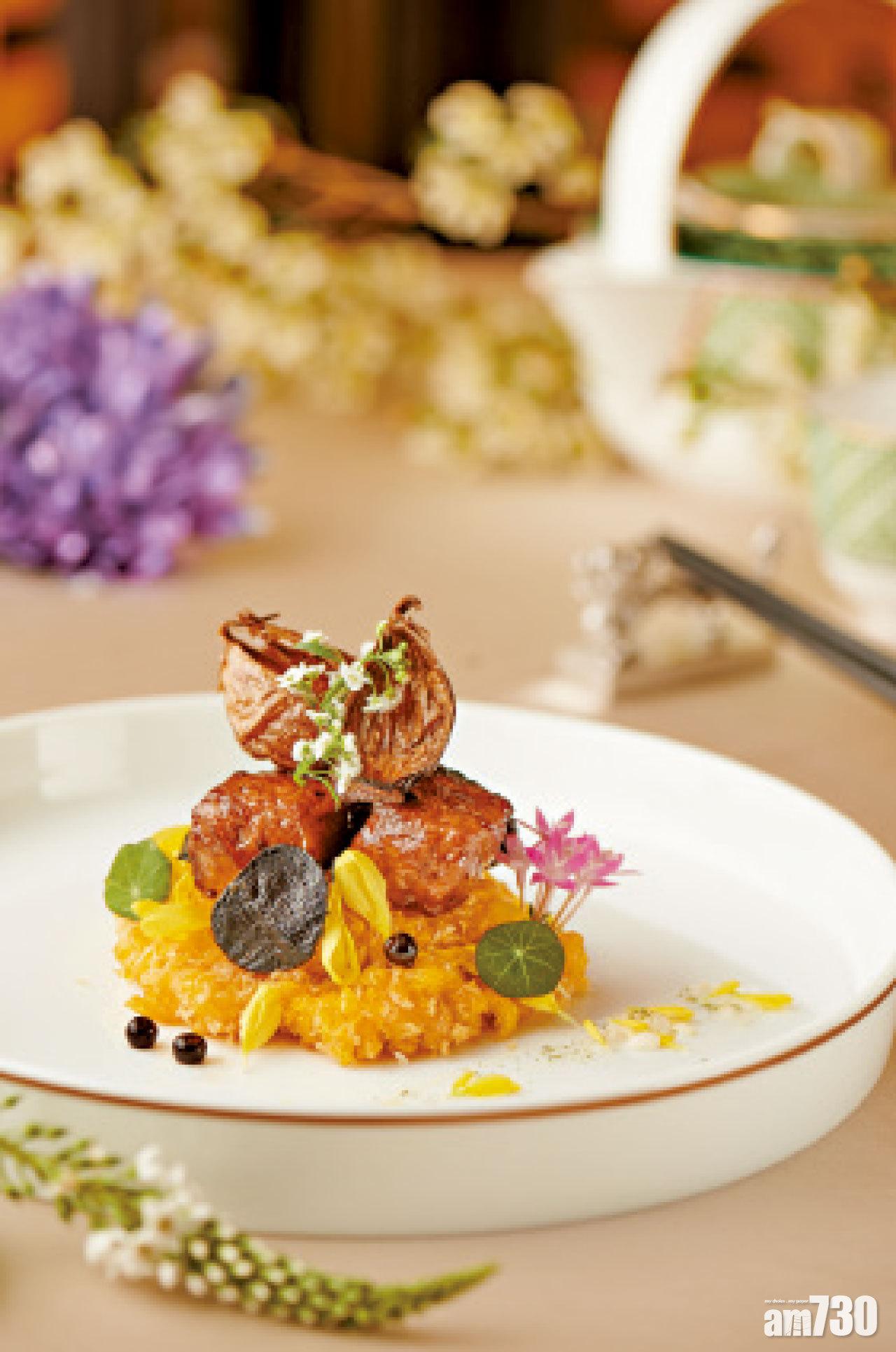 原菊‧脆香──黃金菊花伴佐賀牛方丁,以鮮菊花煉成的菊花油煎香和牛丁,再綴以脆炸原朵菊花,佐以本地檸檬葉及鮮菊花製的醒胃醬汁,營造豐富層次,菊香與和牛的豐腴相互提升。