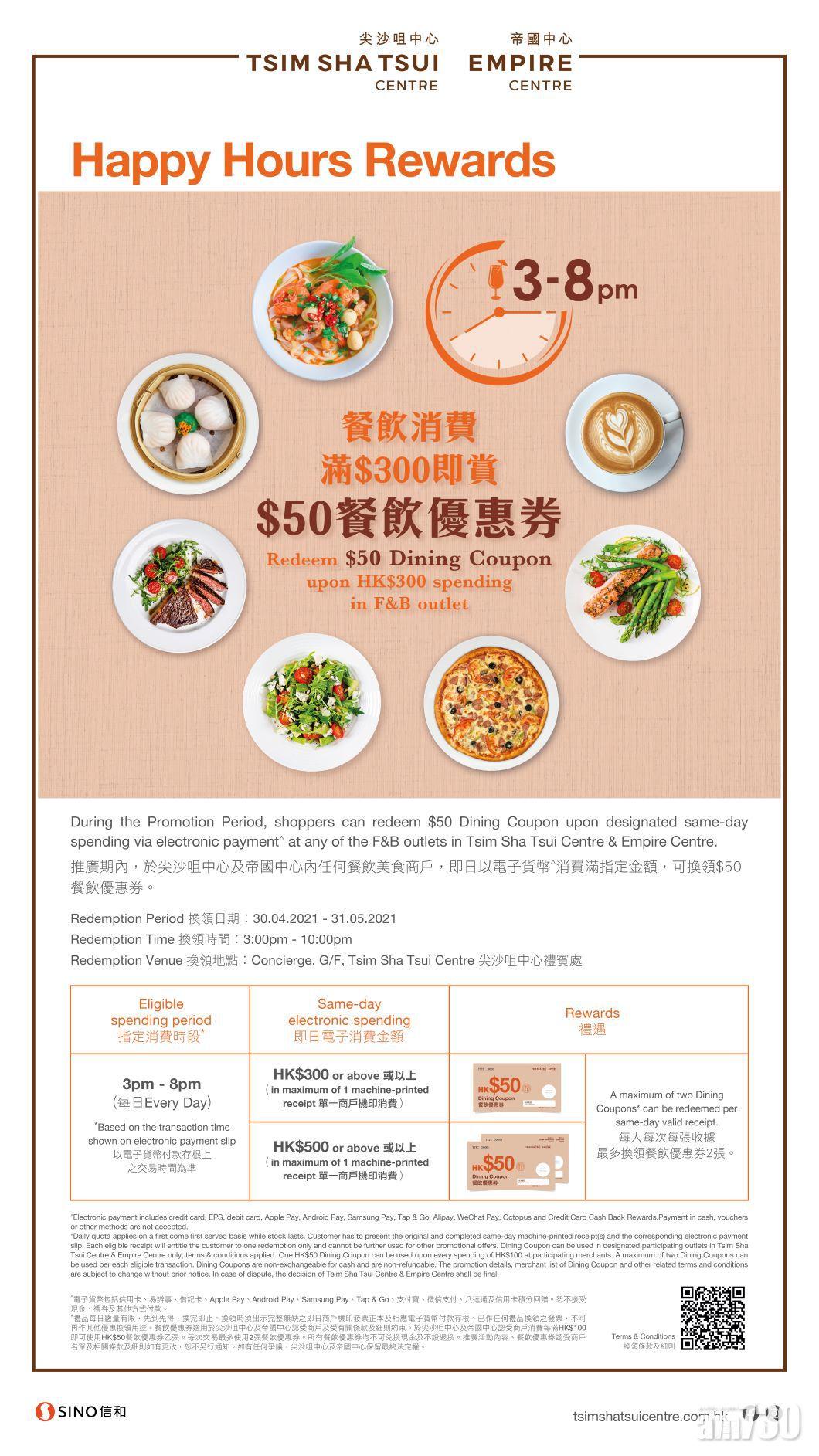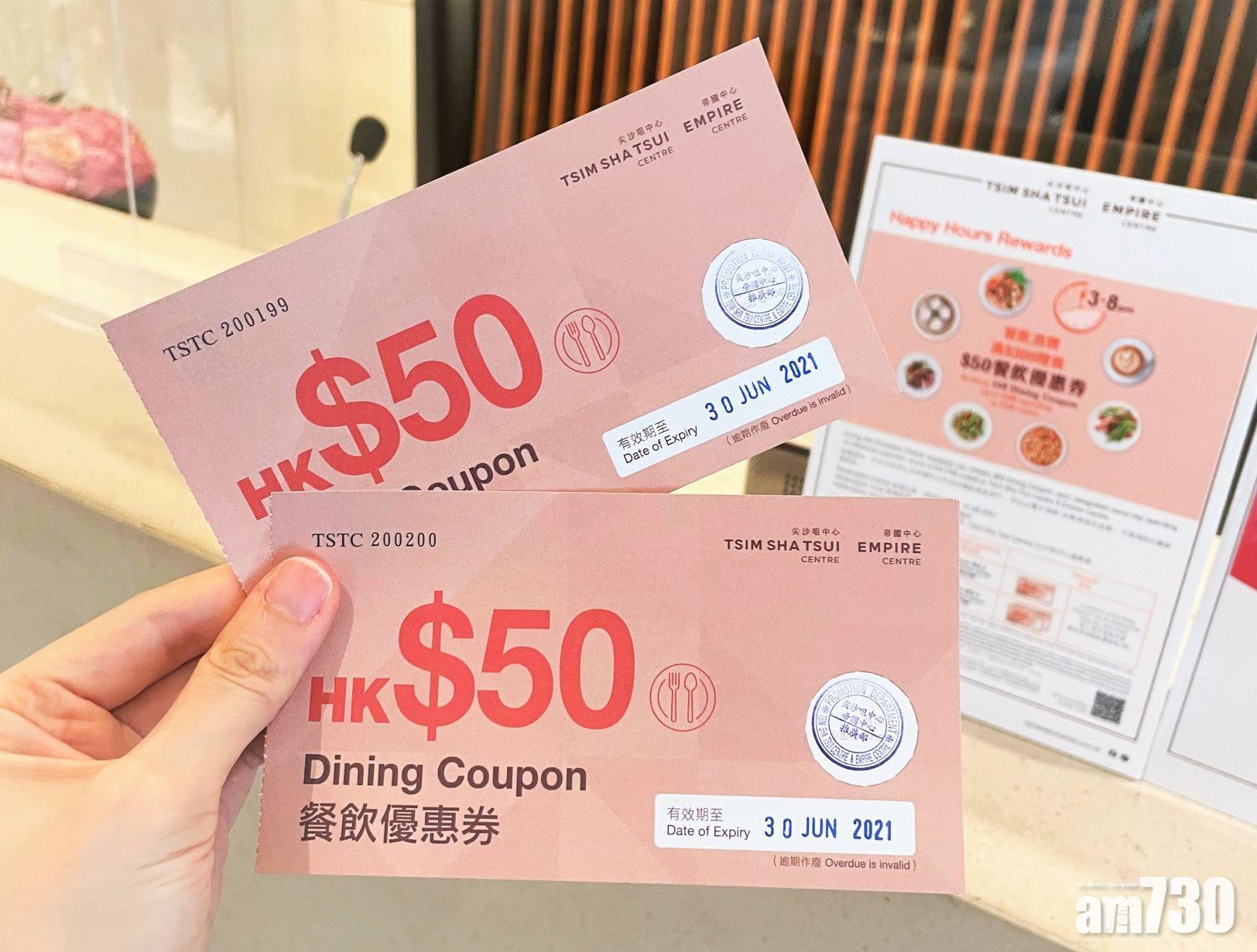 到尖沙咀中心及帝國中心內任何餐飲美食商戶消費滿指定金額,即可換領 $50 餐飲優惠券!