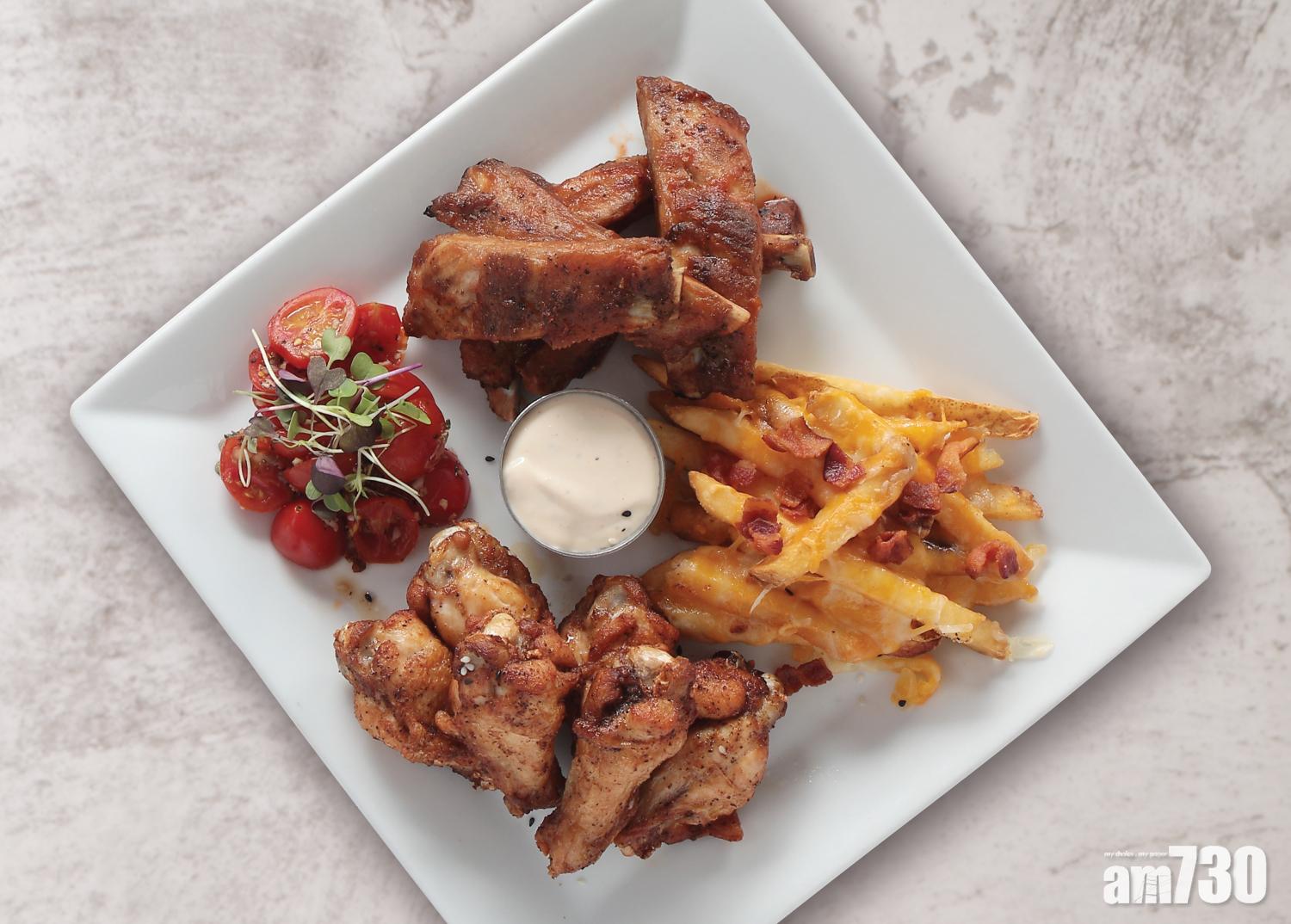 烤肋骨雞搥芝士薯條拼盤─香辣炸雞搥(五件)、香脆薯條混芝士、迷你燒豬肋骨。$178