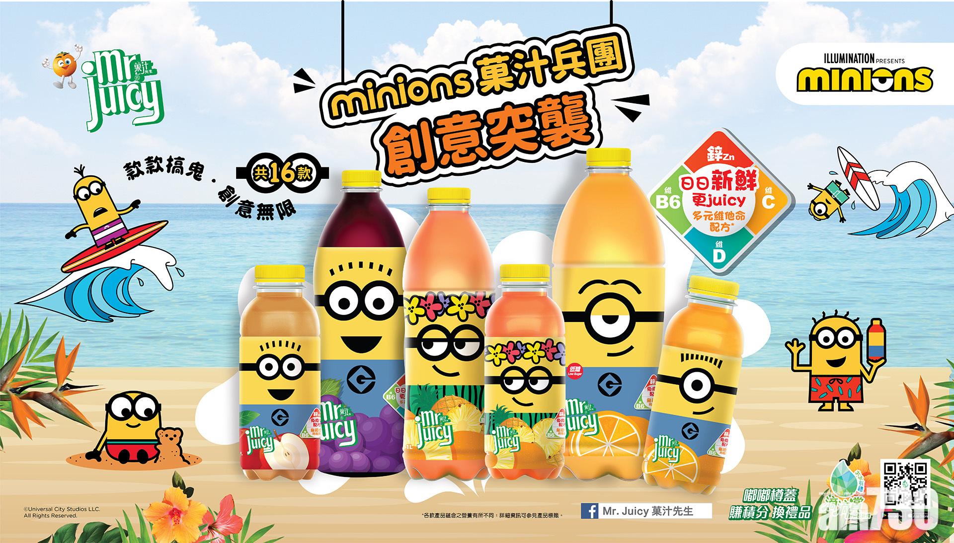Mr. Juicy 菓汁先生 夥拍風靡全球的minions聯「萌」,推出一系列限定搞鬼新包裝,實行玩轉菓汁工廠!趣緻鬼馬的Kevin、Stuart、Bob搖身一變,為Mr. Juicy菓汁先生帶來共16款玩味造型,更推出「minions菓汁兵團創意突襲大抽獎」,即掃即賞,人人有獎,繼續放送無限歡樂!