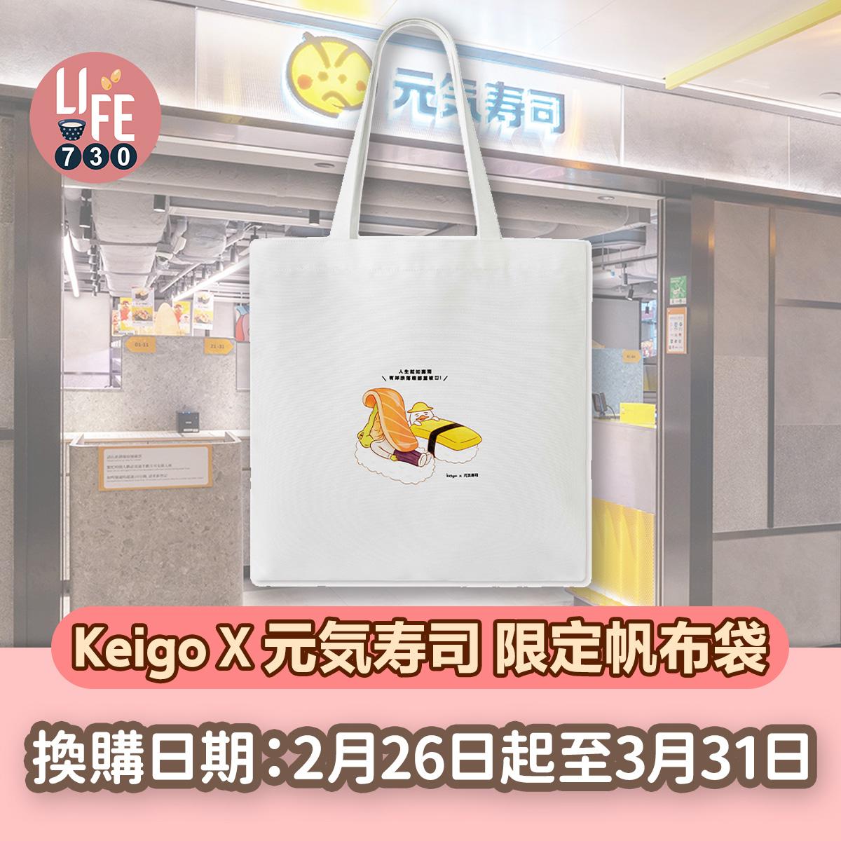 除了一系列獨家限定精品,元気寿司更聯乘Keigo設計限定版帆布袋,精緻的帆布袋印上鱷魚和德德化身壽司的趣怪圖案。顧客於「外賣自取網上訂購」平台淨消費滿$250或以上,可加$10換購「Keigo X 元気寿司限定版帆布袋」1個。每次消費最多可換購一份禮品,數量有限,換完即止。