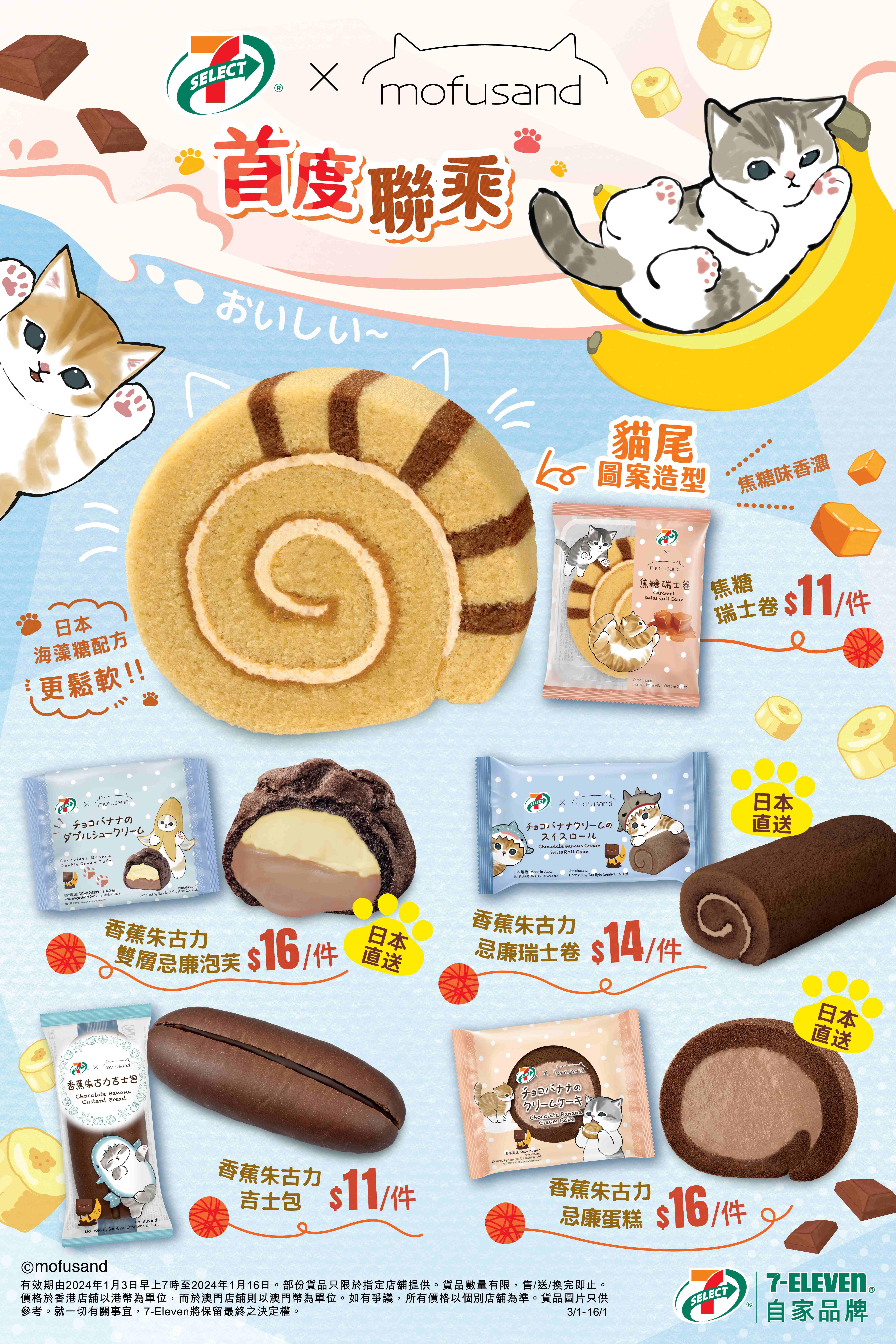 7-SELECT聯乘mofusand系列烘焙新品將於 1 月 3 日開始發售,喜愛mofusand的粉絲記得準時到 7- Eleven,品嚐焦糖和香蕉朱古力的雙重滋味。接下來還有一系列 7-Eleven 和 mofusand 的聯乘產品,請密切期待!