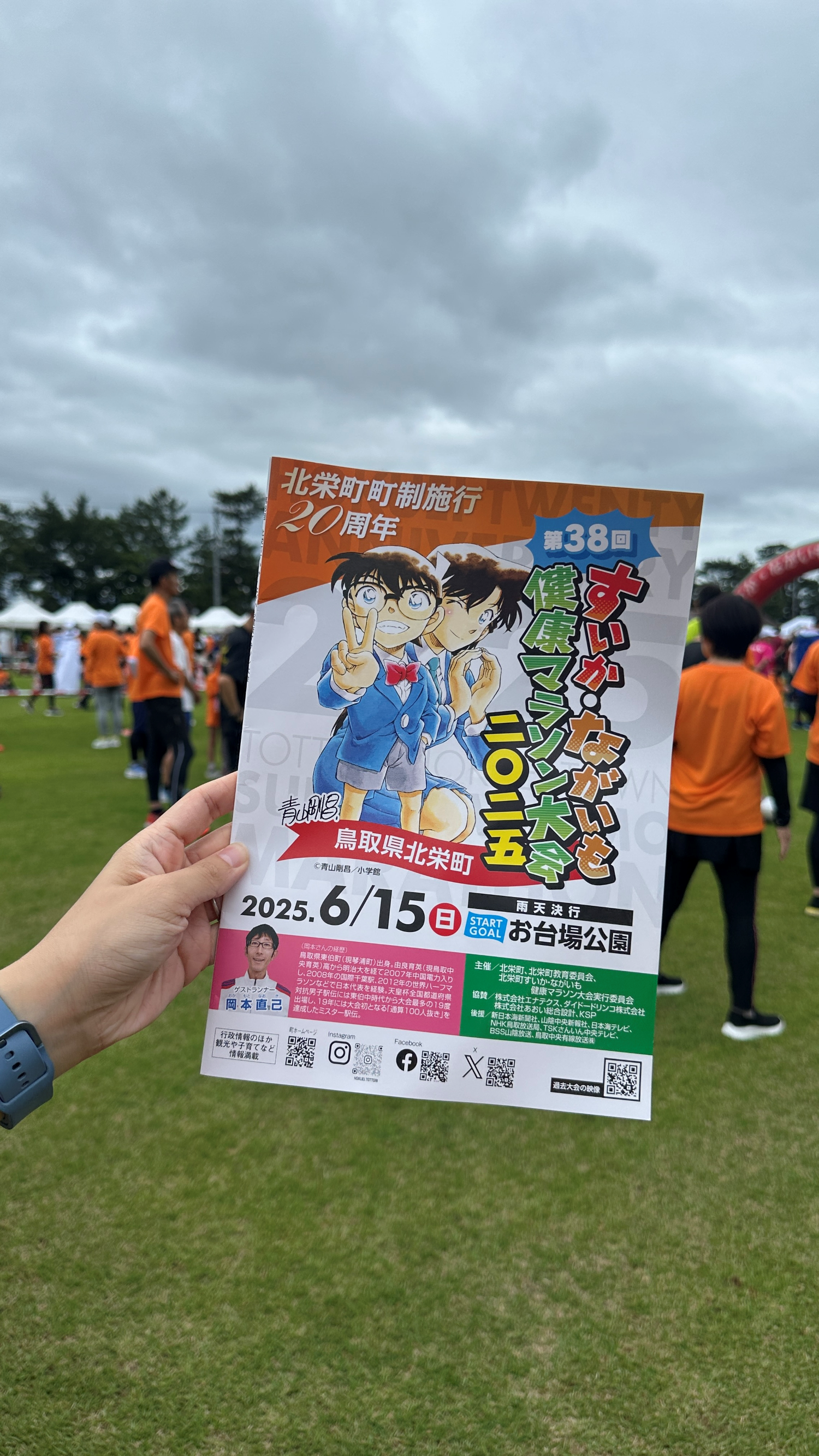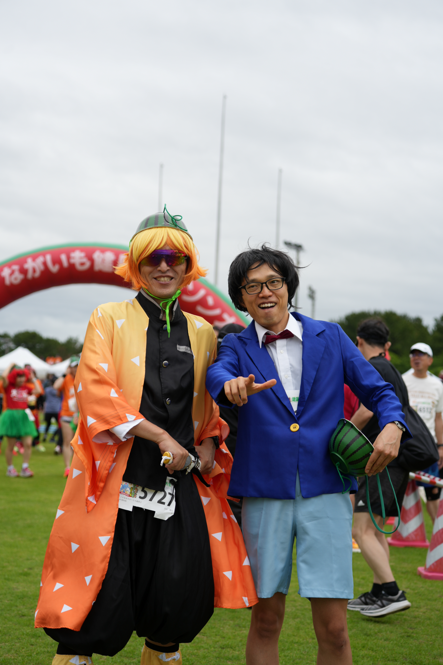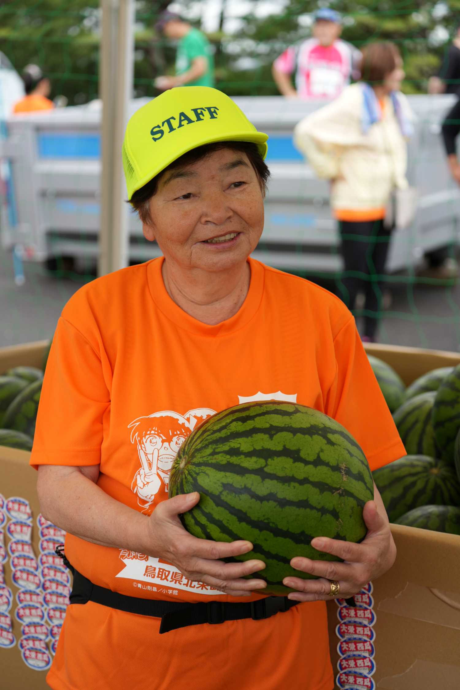 這場健康馬拉松自2008年於鳥取北榮町舉辦,結合當地三大名物:日本第一的大榮西瓜、滋補養生的長芋、以及著名漫畫《名偵探柯南》(漫畫家青山剛昌正是北榮町出身)於一身,賽事設有三公里及十公里路線,無論是初學者或資深跑手皆可參與。當中不少人醉翁之意不在「跑」,比起練跑更用心地Cosplay打扮,會場內有柯南、怪盜基德、船梨精及西瓜人等角色,令賽場彷彿變成一場動漫嘉年華。