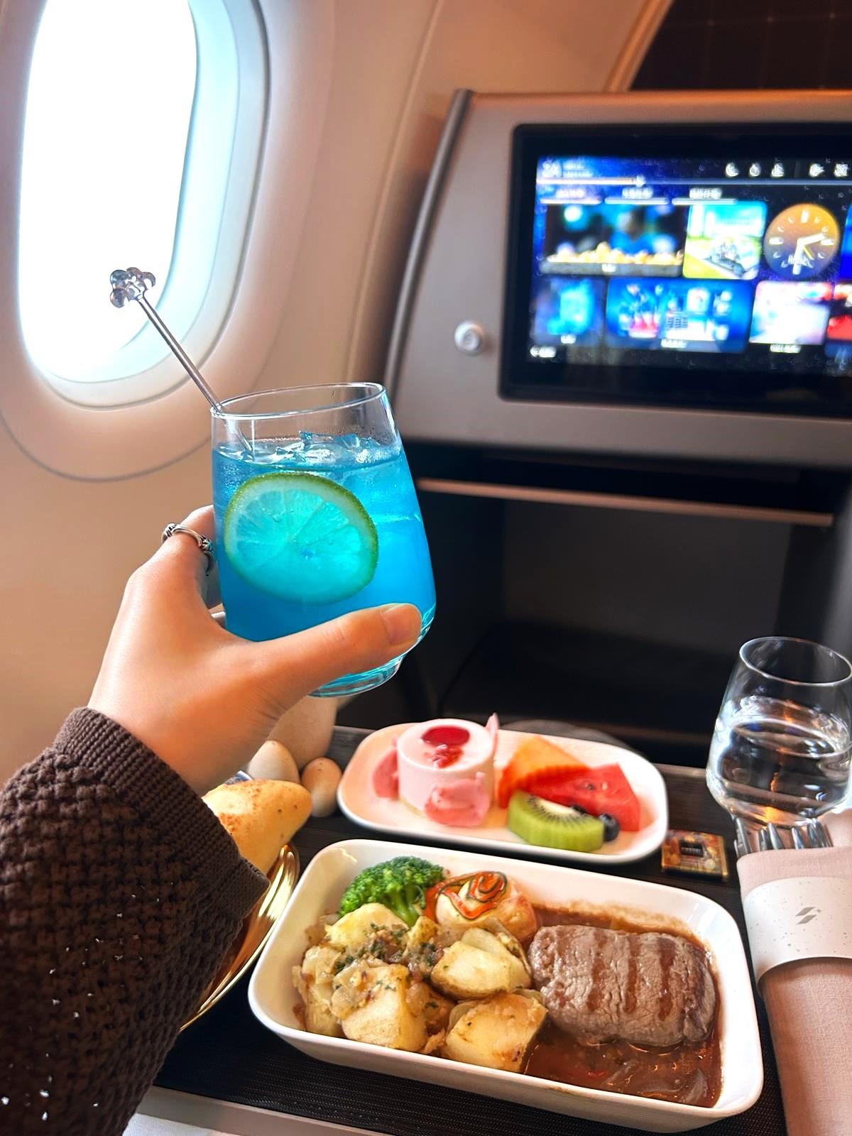 商務艙的餐飲誠意十足,與米芝蓮餐廳、知名餐飲品牌「胡同燒肉」合作,揉合各地飲食文化,在空中提供星級餐飲服務。最吸引的是與米芝蓮星級主廚林明建合作設計獨家菜單,以「從產地到天空 From Farm to Sky」為靈感,嚴選時令今材,讓大家品嘗亞洲創意佳餚。餐酒方面,除了使用英國皇室指定釀酒品牌BOLLINGER外,必試由台灣指標性的台南酒吧Bar TCRC及Bar Home主理人黃奕翔打造的調酒系列「星空特調」,當中的「湛藍宇宙2.0」更是網紅上機必點的打卡餐飲!
