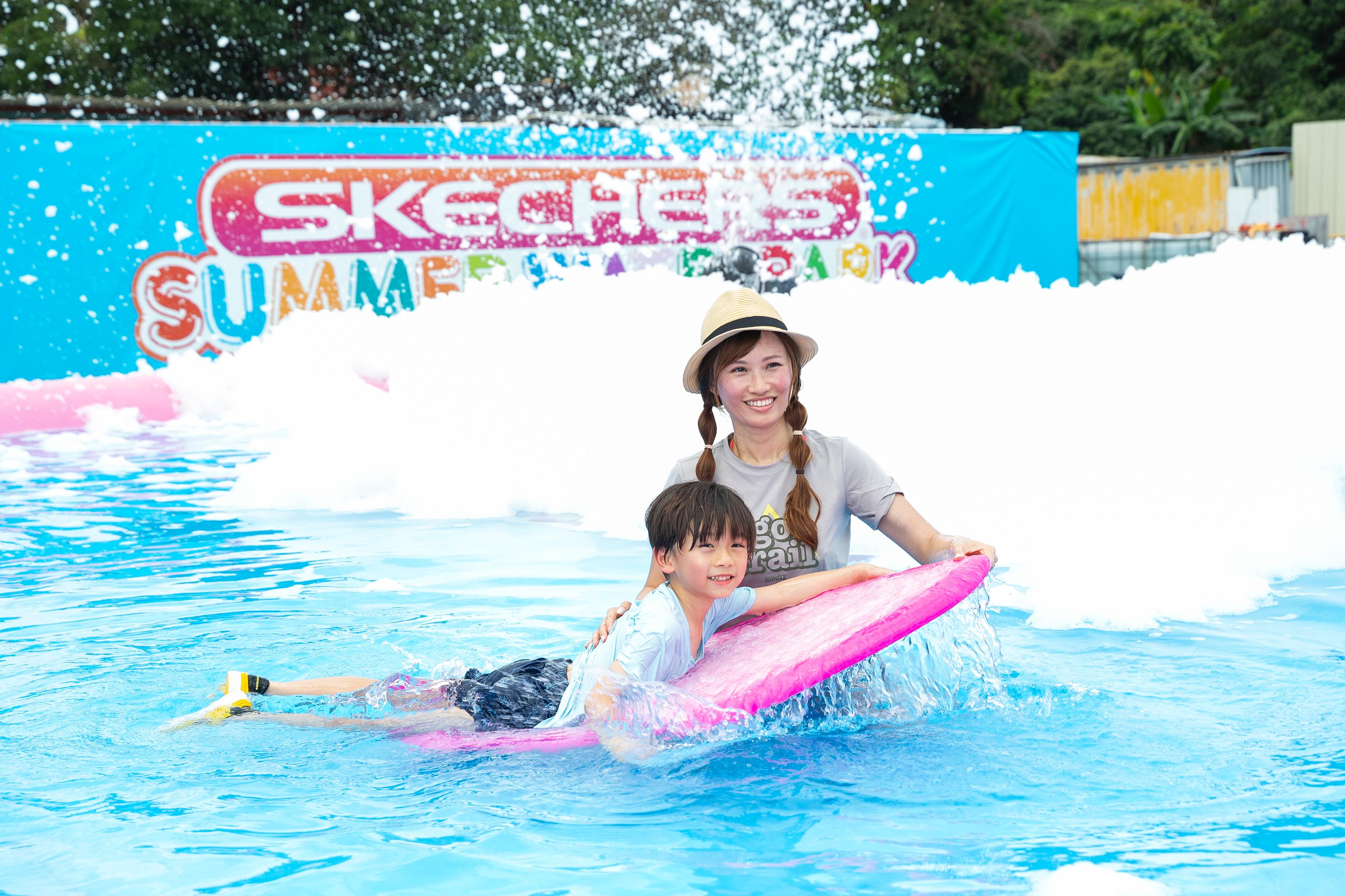 更配合SKECHERS全新夏日配色的FOAMIES®涼鞋系列,增設「SKECHERS FOAMIES®泡泡大戰」專區,舉行泡泡派對,大量冰雪般泡沫,給身處炎炎夏日中的大小朋友帶來一份清涼感覺!今年同時加入多個多元化特色體驗,其中有適合大人小朋友挑戰的沙板,此項體驗結合滑板與衝浪,於平坦的淺水區域,以助跑作為動力,享受滑水般的乘風快感;另有為小朋友而設的美人魚體驗,齊齊化身小小美人魚,於水中擺出可愛姿勢打卡影相。場內的SKECHERS FOAMIES®期間限定店更會提供特別折扣,讓大家即時入手FOAMIES®涼鞋,玩轉盛夏!