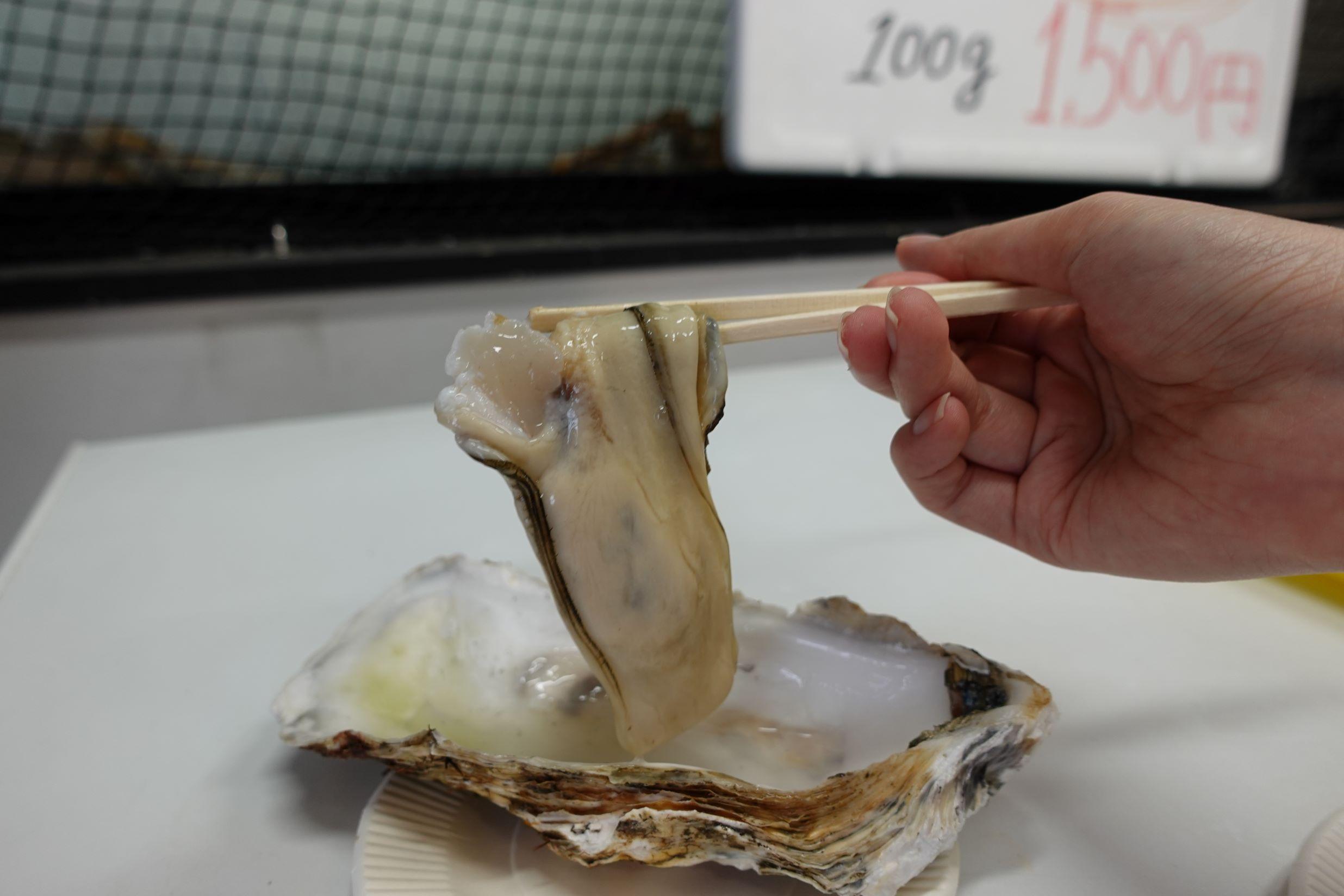 首先第一間要推介的是中原水產,舖頭設有立食區,方便遊客即場開餐。檔口擺放大量海產,除了大大粒的帆立貝、北寄貝外,當然還有新鮮生蠔,每隻650日圓,即是約35港元,在日本不是最便宜,但就一定比香港便宜,生蠔選用日本岩蠔,每隻都有手掌大小,肥美又肉厚,味道鮮甜, 一口吃不完。