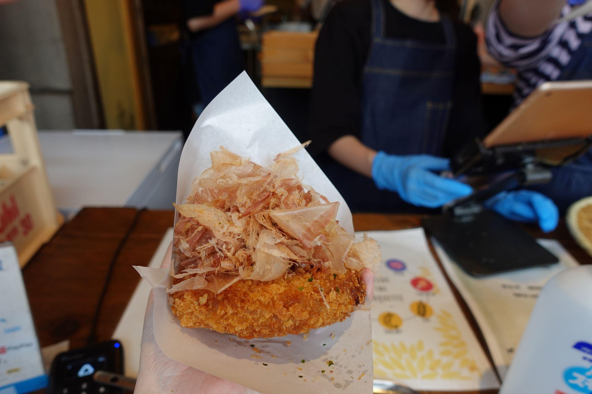「築地コロッケ」是去年才新開業的人氣小店,專賣非常少見的吉列文字燒,吸引不少本地人前往光顧。店家將傳統鐵板文字燒搖身一變製成香口炸物,外皮香脆,內裡的文字燒黏口熱辣,另外再配上明太子醬和木魚碎,整體層次豐富!