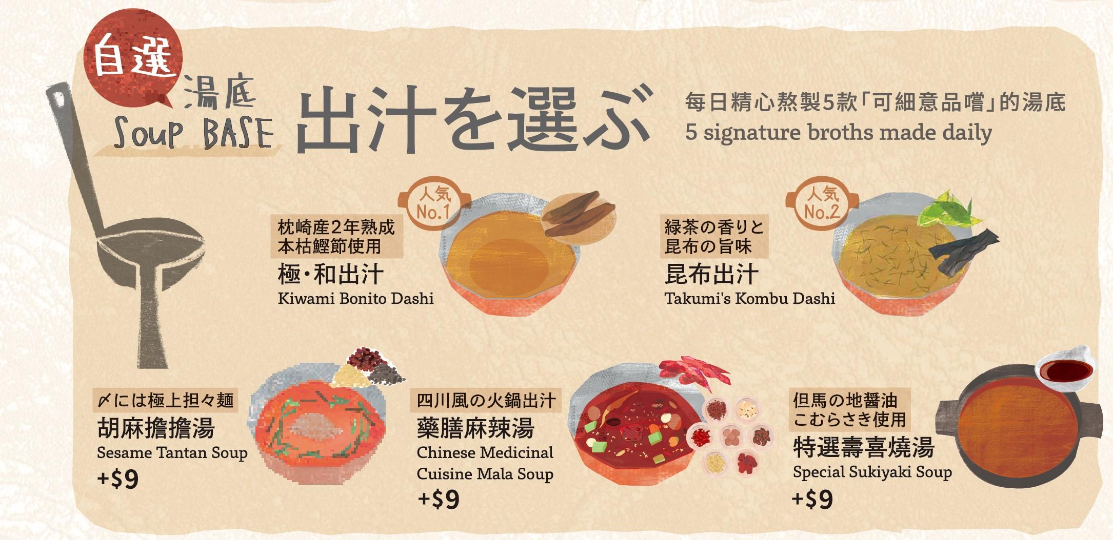 除了肉品及蔬菜,湯底亦是火鍋的靈魂。「LE-TA-SU一人一鍋」深諳此道,特意帶來五款每日精心熬製「可細意品嚐」的湯底供選擇,包括「LE-TA-SU一人一鍋」的招牌湯底,以5種來自鹿兒島縣枕崎市、熟成兩年後刨花的特級鰹魚乾熬製、能同時突出野菜和肉類滋味的無添加人氣NO.1的「極・和出汁」和充滿昆布鮮味及綠茶香氣的「昆布出汁」湯底;微辣且帶香濃芝麻香的「胡麻擔擔湯」;以紅棗片、金針菜、燈籠椒、八角等藥材製作、香辣可口的「藥膳麻辣湯」湯底,當然亦有港人最愛的經典香甜「特選壽喜燒」湯底,讓湯汁注滿每一道食材,再加上多款特色蘸醬,包括自家製柚子醋、LETASU特製胡麻醬、蜂蜜醬油及中華麻辣醬,配搭精心挑選的各款主食及野菜拼盤、前菜及特選鍋伴等,獨創屬於你自己一人的火鍋盛宴!